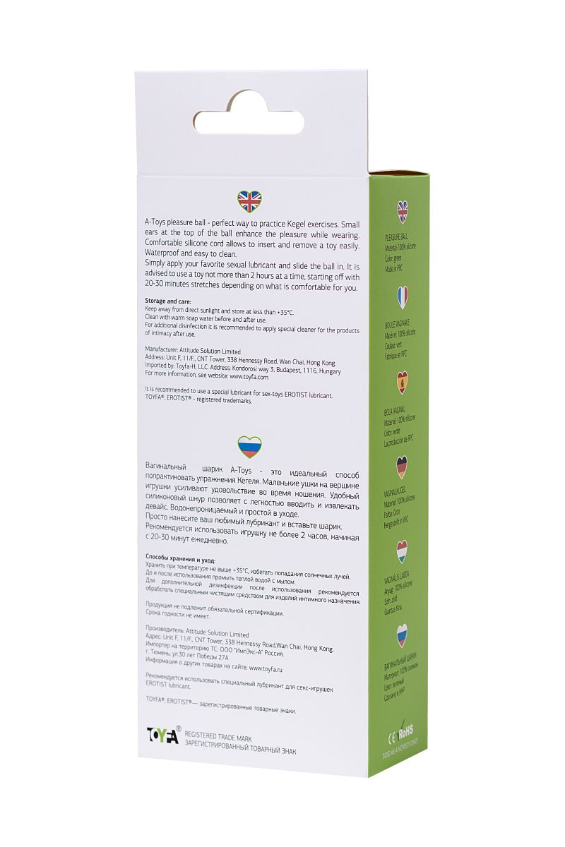 Вагинальный шарик A-Toys — это идеальный способ попрактиковать упражнения Кегеля. Маленькие ушки на вершине игрушки усиливают удовольствие во время ношения. Удобный силиконовый шнур позволяет с легкостью вводить и извлекать девайс. Водонепроницаемый и простой в уходе. Просто нанесите ваш любимый лубрикант и вставьте шарик. Рекомендуется использовать игрушку не более 2 часов, начиная с 20-30 минут ежедневно. Рабочая длина - 2,9 см. Вес - 34 гр.