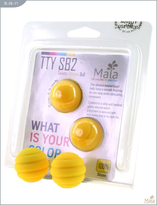 Тренажер Кегеля Twistty, металлические с силиконовым покрытием, жёлтые. Два шарика с рельефной поверхностью для тренировки мышц влагалища. Использование вагинальных шариков положительно влияет на общий тонус женских половых органов и усиливает удовольствие от секса. Можно использовать один или сразу оба шарика.
