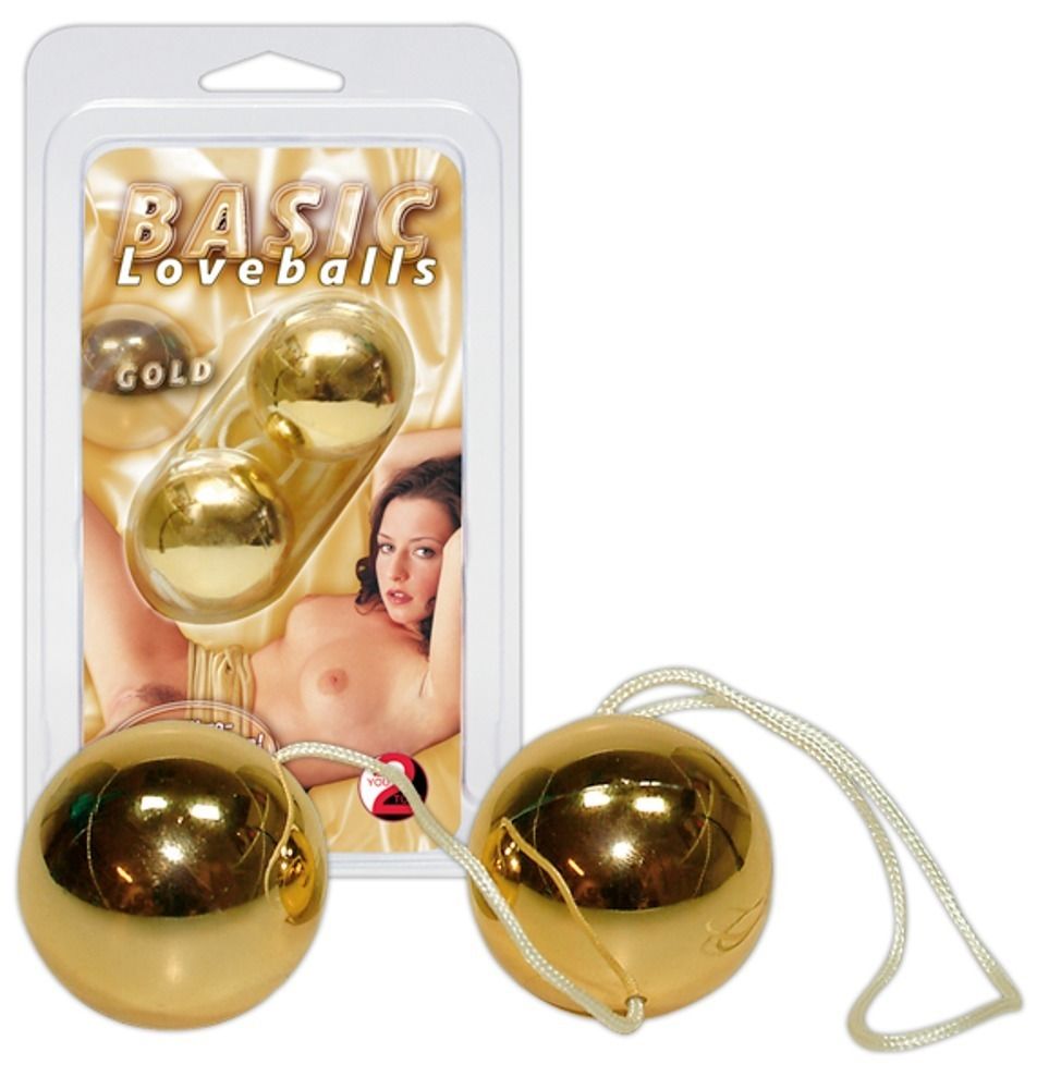 Вагинальные шарики со смещенным центром тяжести, внутри находится перемещающийся металлический шарик, в гладкой пластмассовой оболочке золотого цвета.