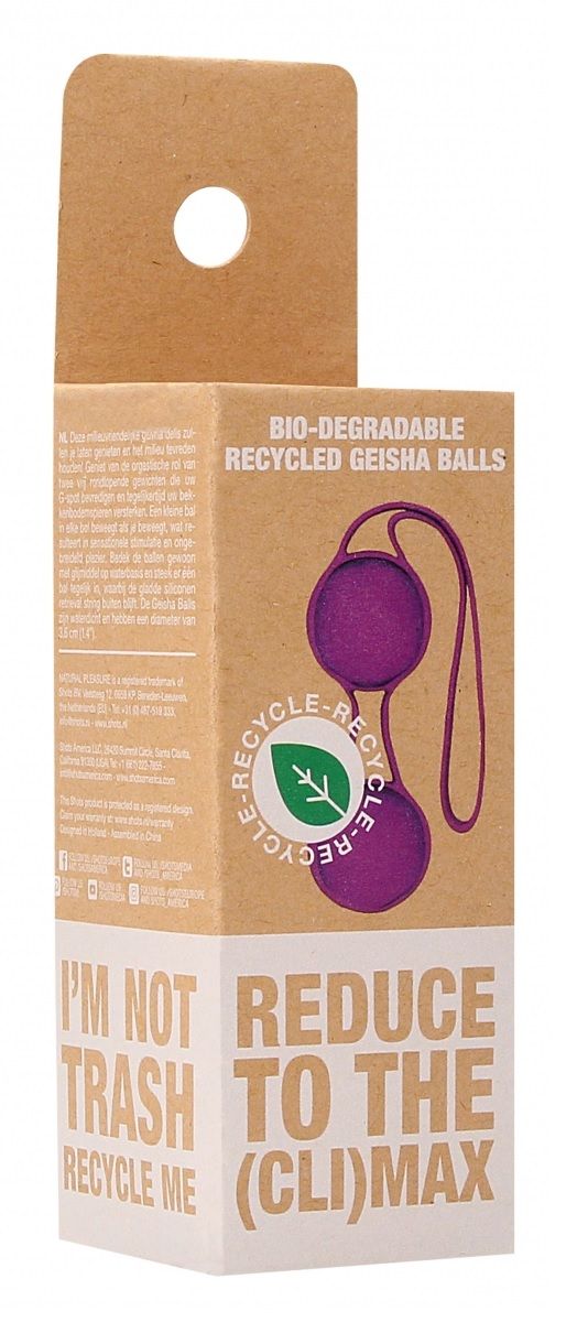 Geisha – двойные шарики Кегеля со смещенным центром тяжести. Шарики изготовлены из безопасного для тела, не содержащего фталаты и не имеющего запаха пластика с превосходными гигиеническими свойствами. Изготовлены из экологичных, безопасных для тела и 100% утилизируемых пластиков на основе веществ биологического происхождения. Упаковка также изготовлены из 100% утилизируемого картона и бумаги. Идеальные вагинальные тренажеры для повышения тонуса и укрепления интимных мышц тазового дна, снижения вероятности болезней мочеиспускательной системы и увеличения сексуального удовольствия. Удобная веревочка с утолщением на кончике позволяет легко извлечь тренажер при необходимости в любой момент.