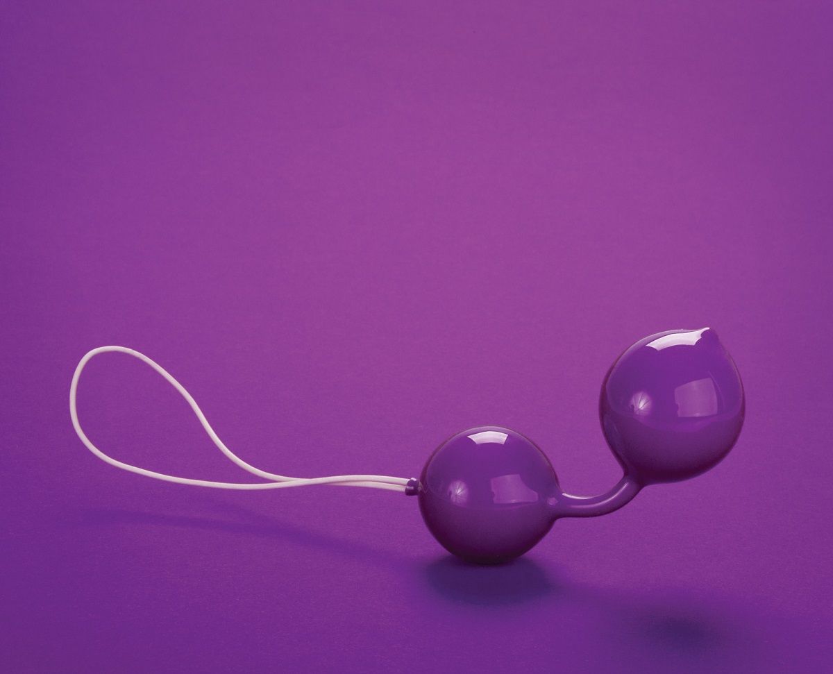 Фиолетовые вагинальные шарики со смещенным центром тяжести для тренировки интимных мышц. Шарики покрыты оболочкой из латекса. Вагинальные шарики используют для сексуального удовольствия. Петля позволяет легко извлекать шарики.