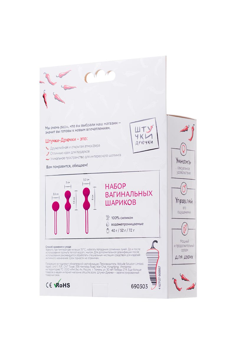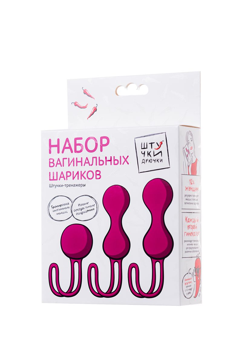 Набор вагинальных шариков со смещенным центром тяжести выполнен из нетоксичного и гипоаллергенного 100% силикона высокого качества. На конце есть петля, позволяющая легко вводить и извлекать игрушку. Водонепроницаемы и просты в уходе. Идеальный способ попрактиковать упражнения Кегеля. Благодаря шарикам разной тяжести вы можете начать тренировки, даже если никогда этого не делали, постепенно увеличивая нагрузку. Вагинальные шарики Штучки-Дрючки укрепляют лк-мышцы, улучшают тонус и упругость мышц влагалища, а также помогают увеличить продолжительность и интенсивность оргазмов. Просто нанесите ваш любимый лубрикант и вставьте шарики. Они абсолютно бесшумны, а петлю для извлечения легко спрятать в нижнем белье. Рекомендуется использовать игрушку не более 2 часов, начиная с 20 - 30 минут ежедневно. Длина больших двойных шариков - 16,5 см., диаметр - 3,2 см., вес - 72 гр. Длина малых двойных шариков - 15,5 см., диаметр - 3 см., вес - 52 гр. Длина одинарного шарика - 12 см., диаметр - 3,6 см., вес - 40 гр.