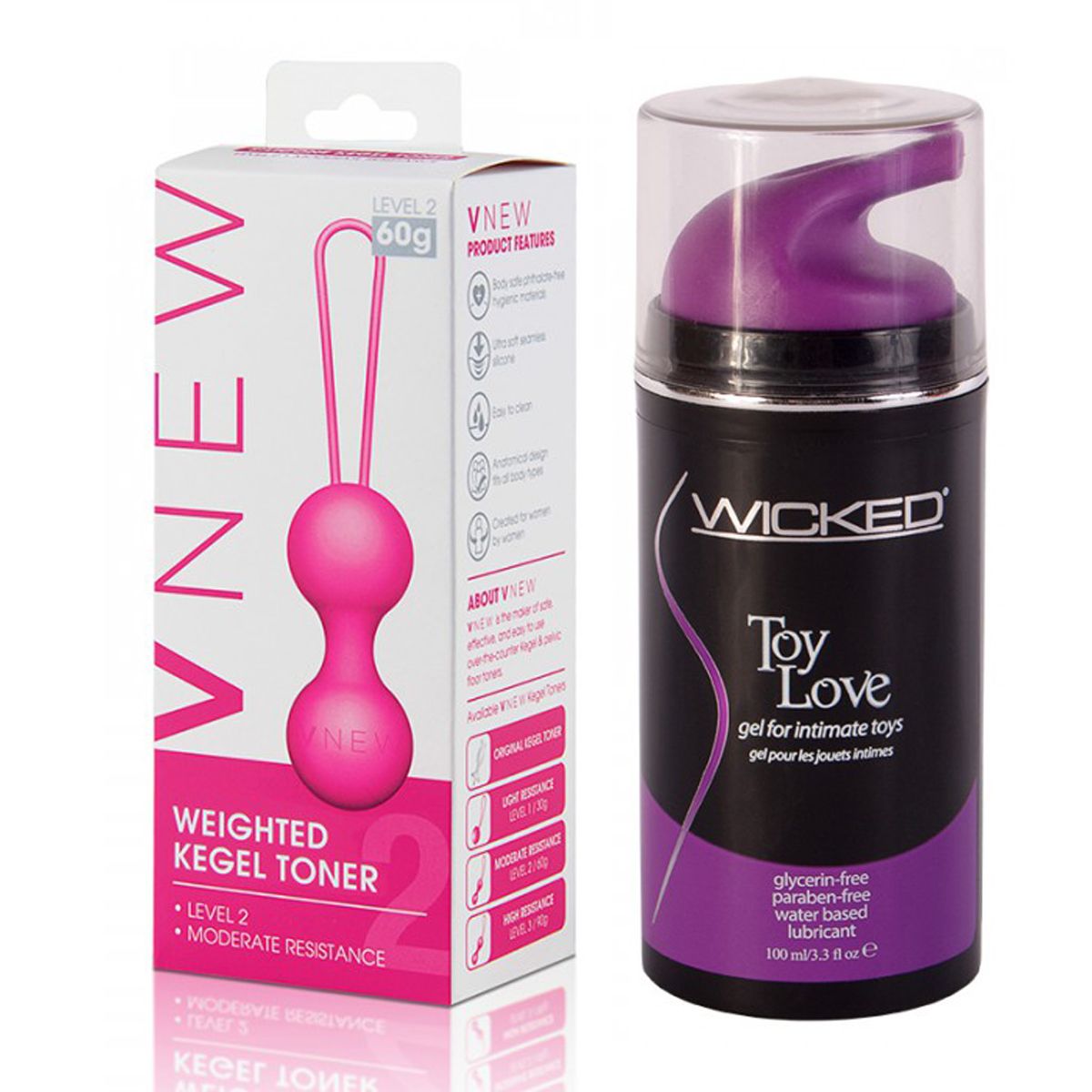 Smart Set №40: вагинальные шарики VNEW level 2 и лубрикант на водной основе. Вагинальный тренажер VNEW level 3 со средним уровнем сопротивления идеально подходит для тренировки мышц тазового дна. Шарики выполнены из безопасного приятного на ощупь бархатистого силикона, внутри шариков дополнительный утяжелитель, который создает смещенный центр тяжести. Тренировка влагалищных мышц позволяет не только испытывать более яркие ощущения при половом контакте, но и подготовиться к рождению малыша, сократить период послеродового восстановления, продлить и укрепить женское здоровье. На тренажере удобный силиконовый шнур для извлечения. В комплекте удобная сумочка для хранения шариков. Удобный и качественный лубрикант в упаковке с помпой для комфорта в использовании. Лубрикант на водной основе, хорошо скользит и долго не впитывается в кожу. Не содержит парабенов и глицерина, в состав формулы входит экстракт листа оливкового дерева, который является природным обеззараживающим компонентом и экстракт алое для смягчения кожи. Плотная консистенция позволяет использовать лубрикант с игрушками, не течет и не пачкает нижнее и постельное белье. Вес шариков - 60 граммов. Объем флакона лубриканта - 100 мл.