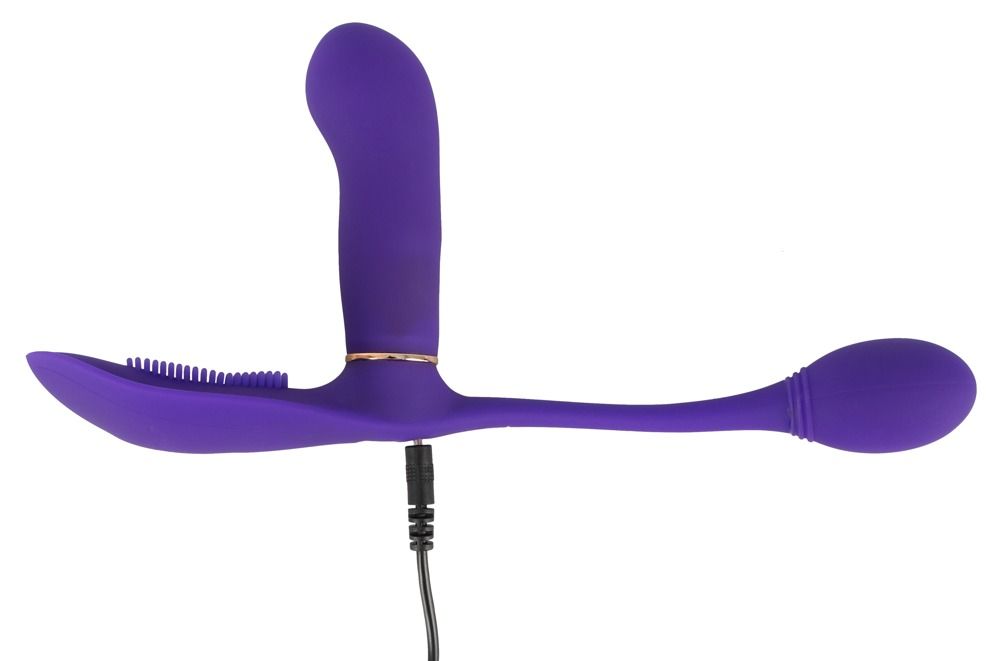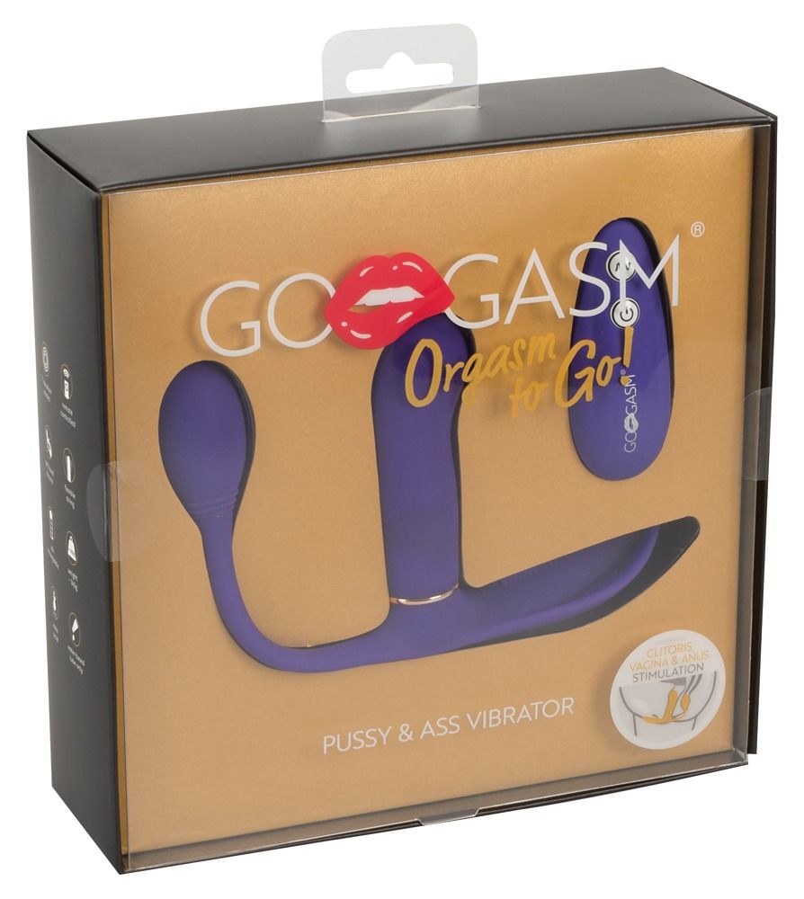Фиолетовый вибромассажёр Go Gasm. Позволяет одновременно стимулировать преддверие вагины, лоно и анус. 3 моторчика обеспечивают 7 режимов вибрации. Рабочая длина вагинального отростка - 9,5 см., диаметр - 2,9 см. Рабочая длина fнального отростка - 4,7 см., диаметр - 2,9 см.