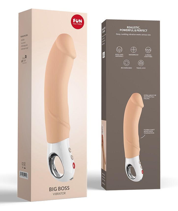 Если душа обычно жаждет большой любви, то тело – больших размеров. Утолить жажду может Big Boss – самый большой вибратор от Fun Factory. Выполненный в форме фаллоса с мощным стволом и пышной головкой, он подарит чувство наполненности и самые сладострастные проникновения! Благодаря бархатистой на ощупь поверхности из медицинского силикона телесного цвета секс-игрушка с лёгкостью проникает внутрь тела и чувственно скользит по стеночкам вагины. 12 программ захватывающей вибрации делают каждый толчок незабываемым и приближают момент сексуальной разрядки. Ручка-кольцо облегчает манипулирование ласковым гигантом. Зарядите Big Boss с помощью Click’N’Charge (в комплекте) и вперёд, за наслаждением – в спальню или под душ (игрушка полностью водонепроницаема)! Рабочая длина - 17 см.