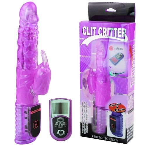 Хай-Тек вибратор Clit Criter фиолетового с функцией вращения ствола и клиторальным стимулятором в виде зайчика. Вибратор управляется при помощи дистанционного пульта с LED-экраном. Ствол приятный на ощупь, выполнен из гипоаллергенного полупрозрачного материала. Рабочая длина - 14 см. Длина клиторального стимулятора - 7 см, диаметр - 3 см. В комплект входит пульт и батарейка к пульту типа 23А.
