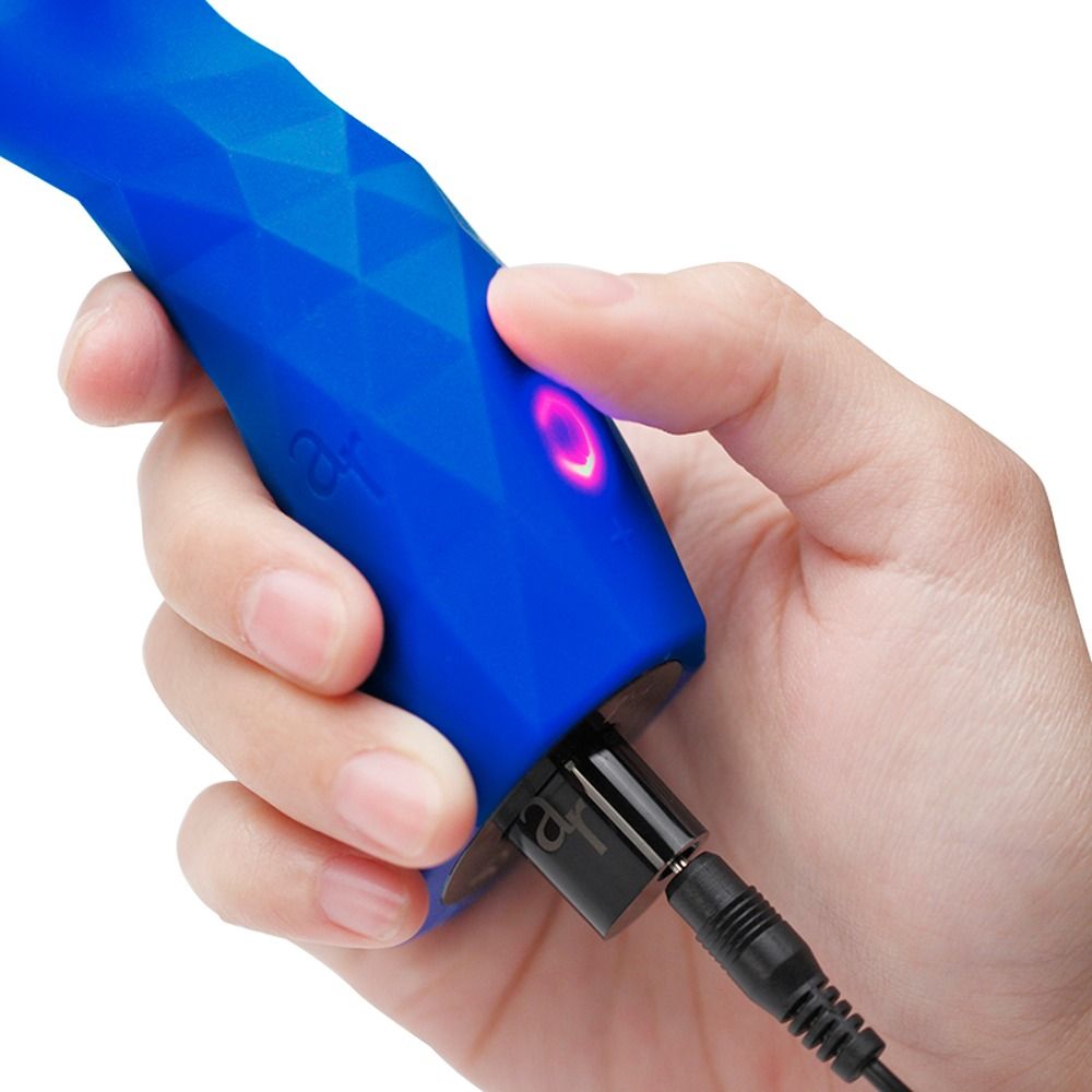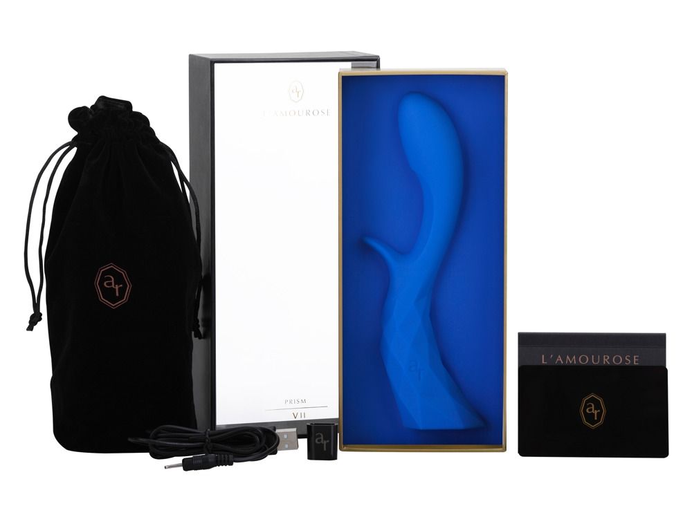 Изогнутый синий вибратор со стимулятором клитора и двумя двигателями. 7 функциональных уровней и 12 скоростей на уровень, которые управляются с помощью 3 кнопок. Перезаряжаемый с помощью прилагаемого USB-кабеля. Рабочая длина - 9,6 см.