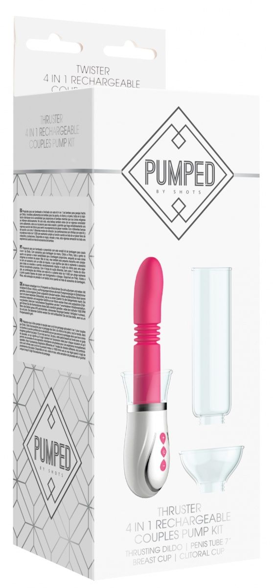 Twister - 4 in 1 Rechargeable Couples Pump Kit - набор, состоящий из 4 предметов. В него входят универсальное основание, к которому могут быть прикреплены помпа для сосков или клитора, помпа для груди или вульвы, помпа для пениса и насадка в виде дилдо с функцией поступательного воздействия. Мощный мотор, способный вращаются со скоростью 11000 об/мин, обеспечивает 4 уровня всасывания и 7 режимов вибрации. Комбинации, которые можно получить с помощью этого набора, бесконечны. Помпы способствуют стимуляции и увеличению чувствительности сосков, клитора, груди, вульвы. Помпа для пениса обеспечивает более твердую эрекцию, а также при регулярном использовании увеличение полового органа. Насадка в виде дилдо может быть использована как самостоятельно, так и в сочетании с вагинальной помпой, обеспечивающей одновременную стимуляцию влагалища и сосание клитора и вульвы. Насадка в виде дилдо позволяет обеспечить одновременную стимуляцию влагалища и всасывание клитора. Основа заряжается через специальный аккумуляторный USB кабель, который может быть подключен практически в любом месте. Просто подсоедините идущий в комплекте шнур к изделию и совместимому порту компьютера или USB-адаптера (приобретается отдельно). Полная зарядка занимает 120 минут, ее достаточно для беспрерывной работы в течение 120 минут. Длина основы - 9,3 см. Длина колбы для члена - 24 см., диаметр - 6,9 см. Длина колбы для клитора - 4,5 см. Длина колбы для груди - 5,7 см. Длина насадки - 15,5 см., диаметр - 3,5 см.