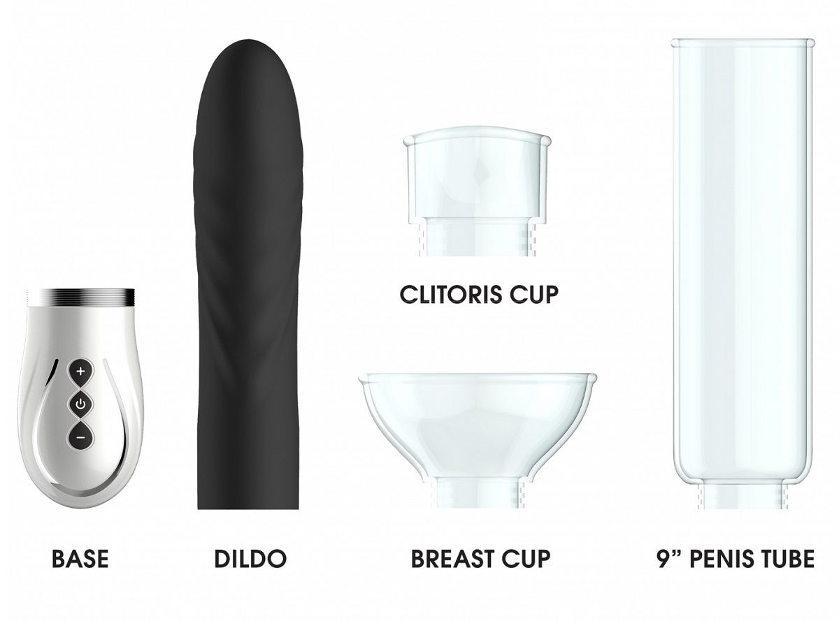 Twister - 4 in 1 Rechargeable Couples Pump Kit - набор, состоящий из 4 предметов. В него входят универсальное основание, к которому могут быть прикреплены помпа для сосков или клитора, помпа для груди или вульвы, помпа для пениса и насадка в виде дилдо с функцией ротация. Мощный мотор, способный вращаются со скоростью 11000 об/мин, обеспечивает 4 уровня всасывания и 7 режимов вибрации. Комбинации, которые можно получить с помощью этого набора, бесконечны. Помпы способствуют стимуляции и увеличению чувствительности сосков, клитора, груди, вульвы. Помпа для пениса обеспечивает более твердую эрекцию, а также при регулярном использовании увеличение полового органа. Насадка в виде дилдо может быть использована как самостоятельно, так и в сочетании с вагинальной помпой, обеспечивающей одновременную стимуляцию влагалища и сосание клитора и вульвы. Насадка в виде дилдо позволяет обеспечить одновременную стимуляцию влагалища и всасывание клитора. Основа заряжается через специальный аккумуляторный USB кабель, который может быть подключен практически в любом месте. Просто подсоедините идущий в комплекте шнур к изделию и совместимому порту компьютера или USB-адаптера (приобретается отдельно). Полная зарядка занимает 120 минут, ее достаточно для беспрерывной работы в течение 120 минут. Длина основы - 9,3 см. Длина колбы для члена - 24 см., диаметр - 6,9 см. Длина колбы для клитора - 4,5 см. Длина колбы для груди - 5,7 см. Длина насадки - 15,5 см., диаметр - 3,5 см.