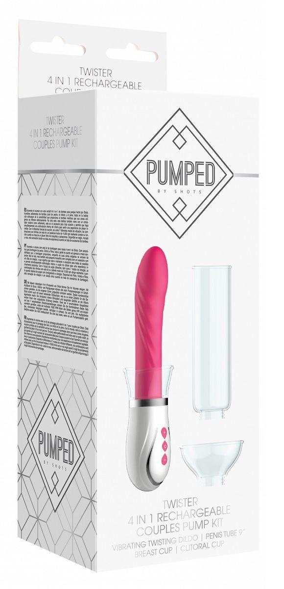 Twister - 4 in 1 Rechargeable Couples Pump Kit - набор, состоящий из 4 предметов. В него входят универсальное основание, к которому могут быть прикреплены помпа для сосков или клитора, помпа для груди или вульвы, помпа для пениса и насадка в виде дилдо с функцией ротация. Мощный мотор, способный вращаются со скоростью 11000 об/мин, обеспечивает 4 уровня всасывания и 7 режимов вибрации. Комбинации, которые можно получить с помощью этого набора, бесконечны. Помпы способствуют стимуляции и увеличению чувствительности сосков, клитора, груди, вульвы. Помпа для пениса обеспечивает более твердую эрекцию, а также при регулярном использовании увеличение полового органа. Насадка в виде дилдо может быть использована как самостоятельно, так и в сочетании с вагинальной помпой, обеспечивающей одновременную стимуляцию влагалища и сосание клитора и вульвы. Насадка в виде дилдо позволяет обеспечить одновременную стимуляцию влагалища и всасывание клитора. Основа заряжается через специальный аккумуляторный USB кабель, который может быть подключен практически в любом месте. Просто подсоедините идущий в комплекте шнур к изделию и совместимому порту компьютера или USB-адаптера (приобретается отдельно). Полная зарядка занимает 120 минут, ее достаточно для беспрерывной работы в течение 120 минут. Длина основы - 9,3 см. Длина колбы для члена - 24 см., диаметр - 6,9 см. Длина колбы для клитора - 4,5 см. Длина колбы для груди - 5,7 см. Длина насадки - 15,5 см., диаметр - 3,5 см.