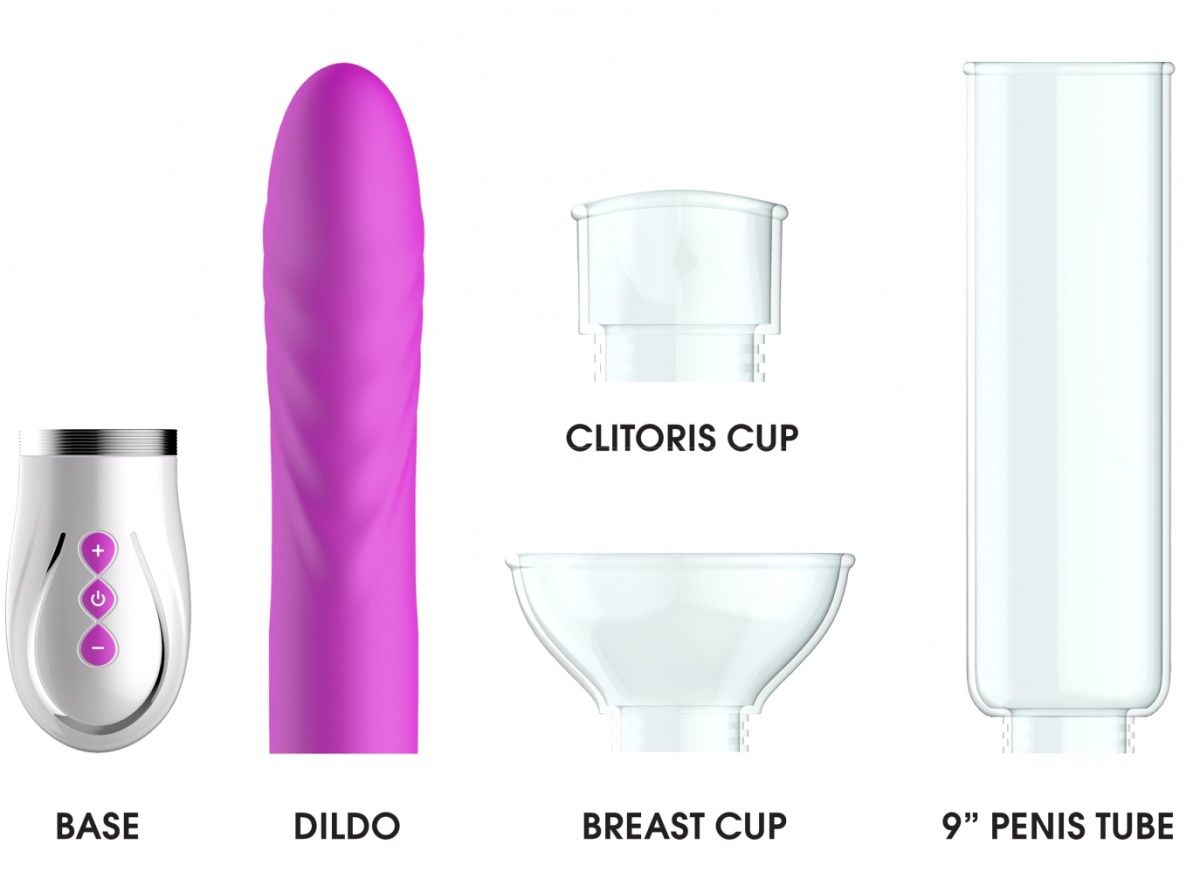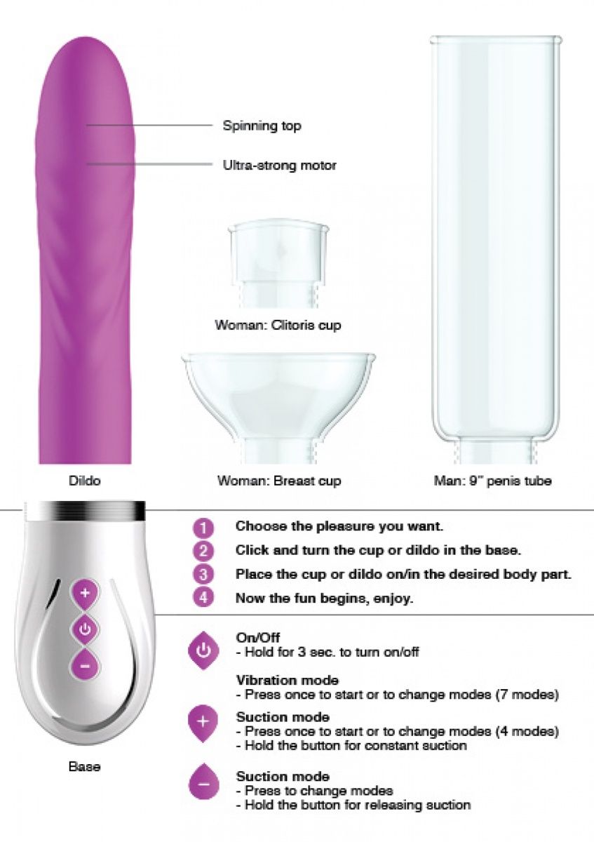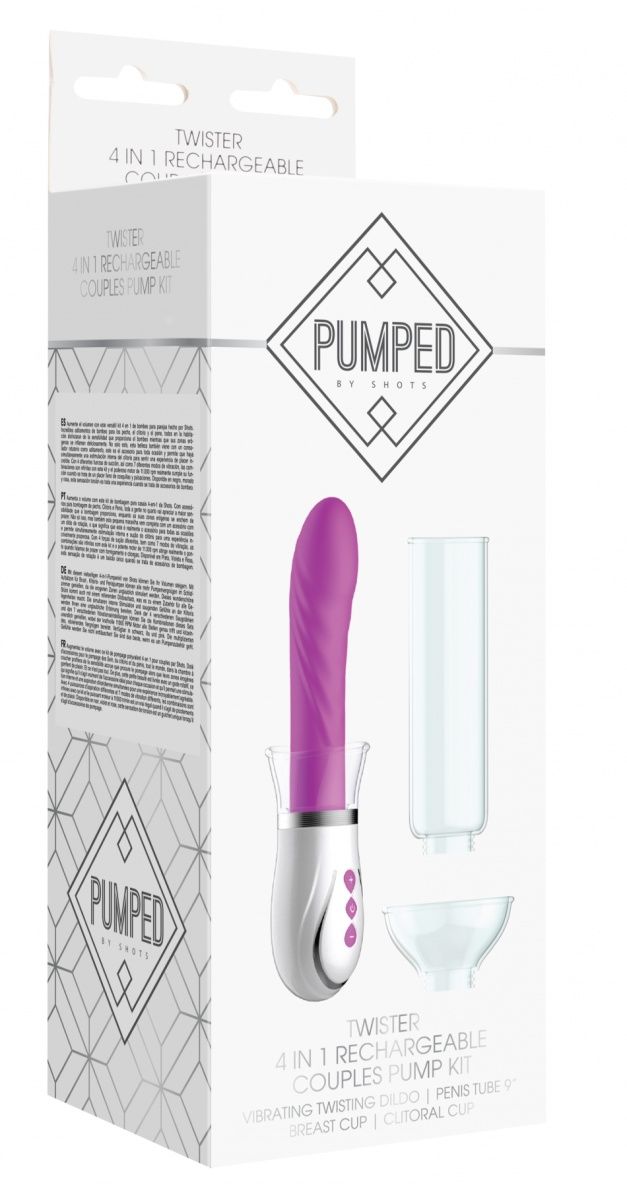 Twister - 4 in 1 Rechargeable Couples Pump Kit - набор, состоящий из 4 предметов. В него входят универсальное основание, к которому могут быть прикреплены помпа для сосков или клитора, помпа для груди или вульвы, помпа для пениса и насадка в виде дилдо с функцией ротация. Мощный мотор, способный вращаются со скоростью 11000 об/мин, обеспечивает 4 уровня всасывания и 7 режимов вибрации. Комбинации, которые можно получить с помощью этого набора, бесконечны. Помпы способствуют стимуляции и увеличению чувствительности сосков, клитора, груди, вульвы. Помпа для пениса обеспечивает более твердую эрекцию, а также при регулярном использовании увеличение полового органа. Насадка в виде дилдо может быть использована как самостоятельно, так и в сочетании с вагинальной помпой, обеспечивающей одновременную стимуляцию влагалища и сосание клитора и вульвы. Насадка в виде дилдо позволяет обеспечить одновременную стимуляцию влагалища и всасывание клитора. Основа заряжается через специальный аккумуляторный USB кабель, который может быть подключен практически в любом месте. Просто подсоедините идущий в комплекте шнур к изделию и совместимому порту компьютера или USB-адаптера (приобретается отдельно). Полная зарядка занимает 120 минут, ее достаточно для беспрерывной работы в течение 120 минут. Длина основы - 9,3 см. Длина колбы для члена - 24 см., диаметр - 6,9 см. Длина колбы для клитора - 4,5 см. Длина колбы для груди - 5,7 см. Длина насадки - 15,5 см., диаметр - 3,5 см.