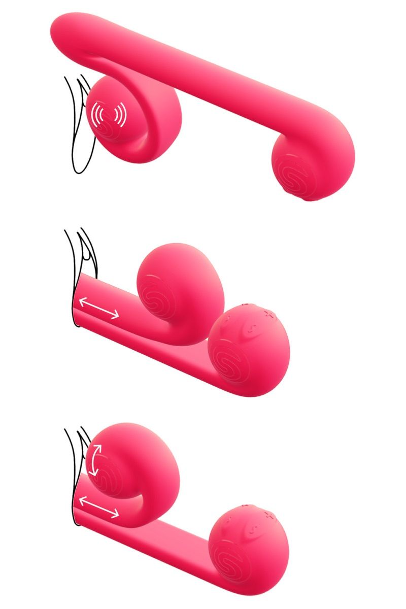 Вибромассажер Snail Vibes – универсальный, мультискоростной, инновационный аккумуляторный вибратор для одновременной двойной стимуляции из гипоаллергенного материала. Главным преимуществом стимулятора является возможность беспрерывной клиторальной стимуляции при одновременном поступательном вагинальном воздействии. Особенностью этого стимулятора является возможность смещать клиторальный отросток вдоль всей длины вагинальной части. Snail по праву можно назвать «первым вибратором по-настоящему двойного действия». Snail разработан с учетом анатомических особенностей. Два мощных мотора с отдельным управлением имеют 5 режимов вибрации и 5 скоростей для каждого из них, что обеспечивает более 600 комбинаций стимуляции. Клиторальный отросток Snail Vibes может достигать настолько интенсивной вибрации, как легендарный Magic Wand. Стержень вибратора подходит как для коротких, так и для глубоких толчков, удовлетворяя индивидуальные предпочтения каждого, в то время как стимулятор клитора имеет более широкую область воздействия, чем традиционные игрушки-кролики. Snail обеспечивает постоянный контакт вибратора и клитора во время использования игрушки. Управление осуществляется с помощью четырех встроенных в основание кнопок. Чтобы включить или выключить один из отростков, необходимо нажать и в течение трех секунд удерживать отвечающую за него кнопку с изображением волны. Вибромассажер заряжается через USB (шнур в комплекте). Время зарядки - 2 часа. Время работы - 1 час. Длина верхнего отростка - 19 см.