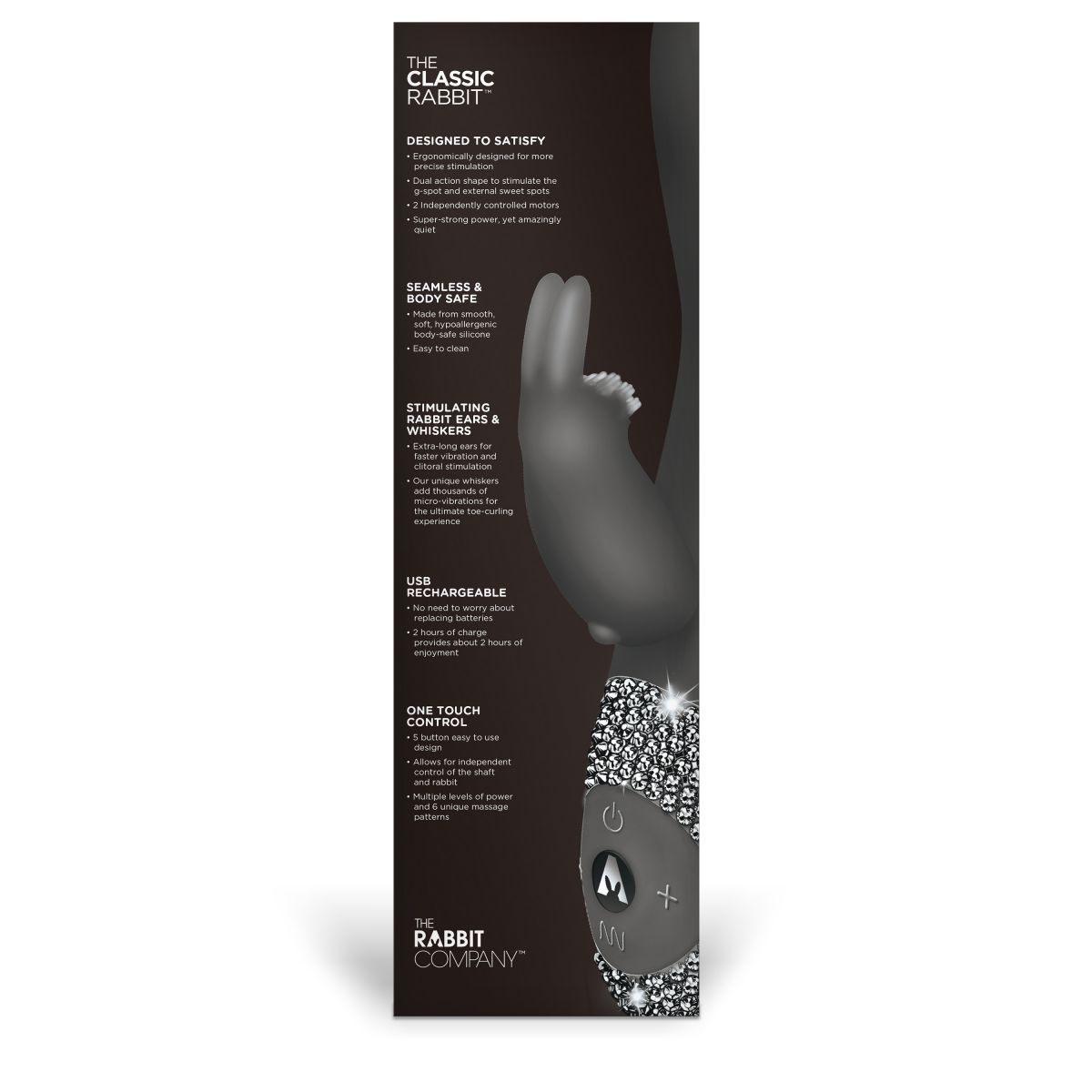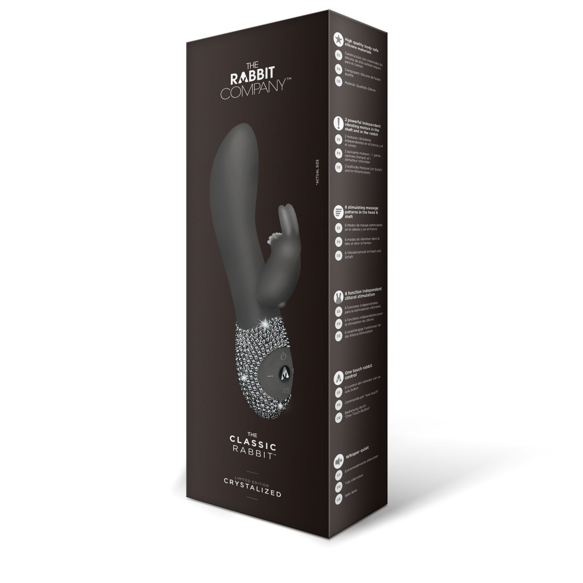 Классика никогда не выходит из моды не только в литературе и одежде, но и когда дело касается удовольствий. Качественный, безопасный и красивый массажер черного цвета с двумя вибромоторчиками большой мощности. Вагинальная часть массажера и клиторальный стимулятор в виде симпатичного зайчика имеет 6 уникальных функций - постоянная вибрация, волновая вибрация, пульсация, нарастающая вибрация, то нарастающая, то ниспадающая вибрация, и рандомная вибрация. На мордочку клиторального кролика нанесена нежная щеточка для дразнящих ощущений во время стимуляции. Данная модель розового цвета из ограниченной коллекции CRYSTALIZED - пульт управления вручную украшен супер переливающимися кристаллами. Кролик имеет очень легкое управление - чтобы включить кролика используй отдельную кнопку включения, тогда одновременно заработают и вагинальная часть и клиторальный зайчик. Рабочая длина - 11 см. Время зарядки - 2 часа. Время работы - 2 часа. В комплекте запасной набор кристаллов.