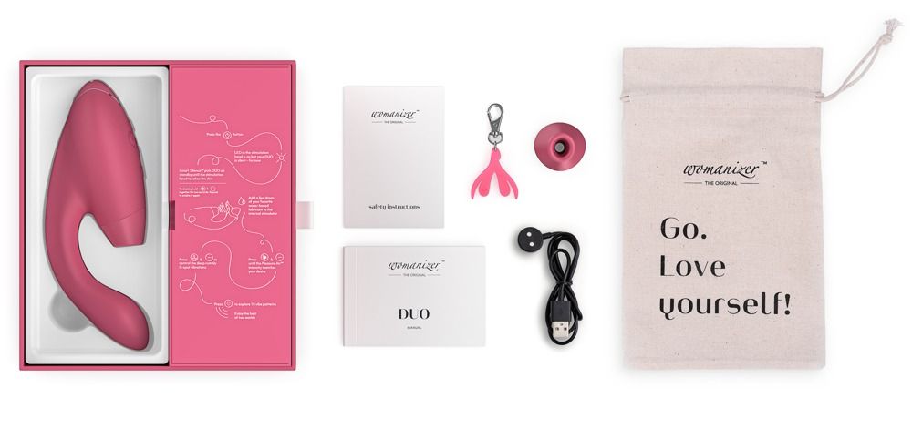 Неважно, являетесь ли вы взыскательной ценительницей удовольствий или просто ищете новых ощущений — Womanizer Duo поднимет Вас к вершинам оргазмических ощущений снова и снова благодаря принципу одновременной стимуляции. DUO имеет клиторальный стимулятор, выполненный в форме традиционного Womanizer – он мягко ласкает клитор с помощью технологии Pleasure Air. Кроме того, у DUO есть мощный вибратор, который адаптируется к форме Вашего тела, чтобы идеально стимулировать Ваши самые важные точки. 10 режимов вибрации и 12 скоростей. Рабочая длина отростка - 11 см., диаметр - 3,5 см.