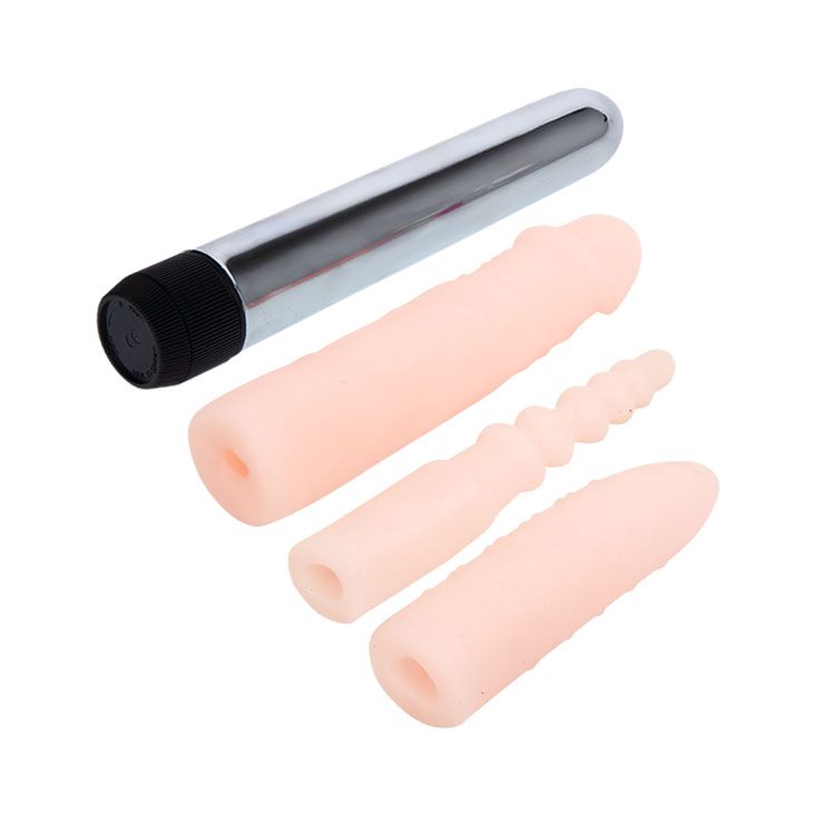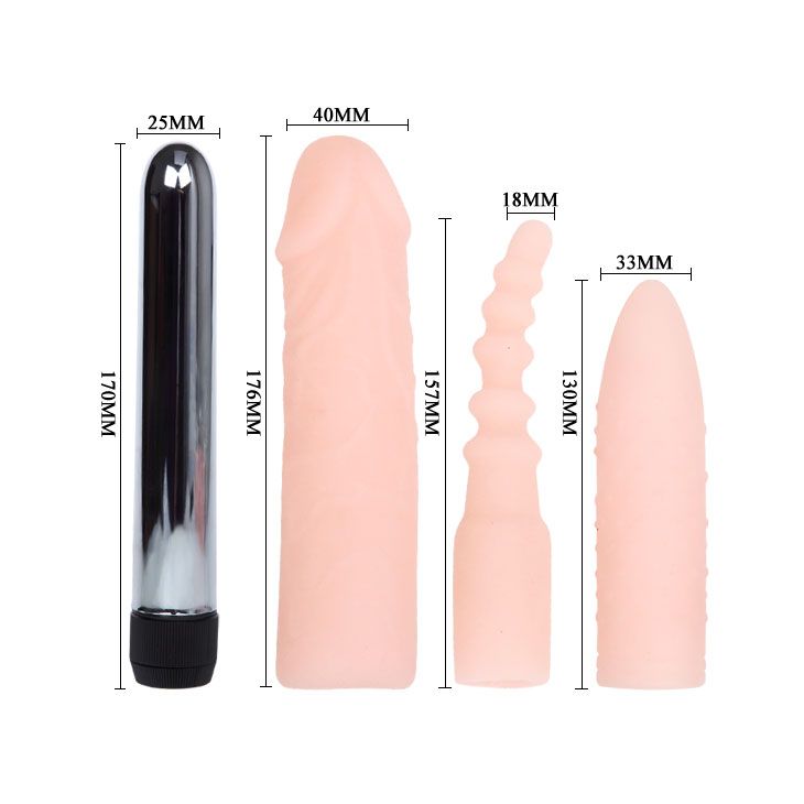 Классический вибратор с тремя телесными сменными насадками. Длина вибратора - 17 см., диаметр - 2,5 см. Длина фаллической насадки - 17,6 см., диаметр - 4 см. Длина пупырчатой насадки - 13 см., диаметр - 3,3 см. Длина анального насадки - 15,7 см., минимальный диаметр - 1,8 см.