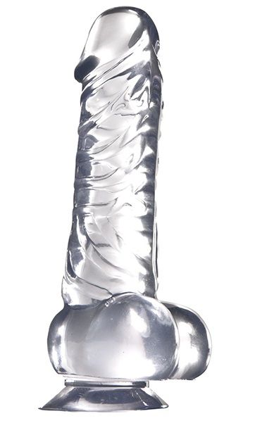 Прозрачный фаллоимитатор на присоске JELLY JOY BRILLIANT. Имеет пышную мошонку и ярко выраженный рисунок вен.