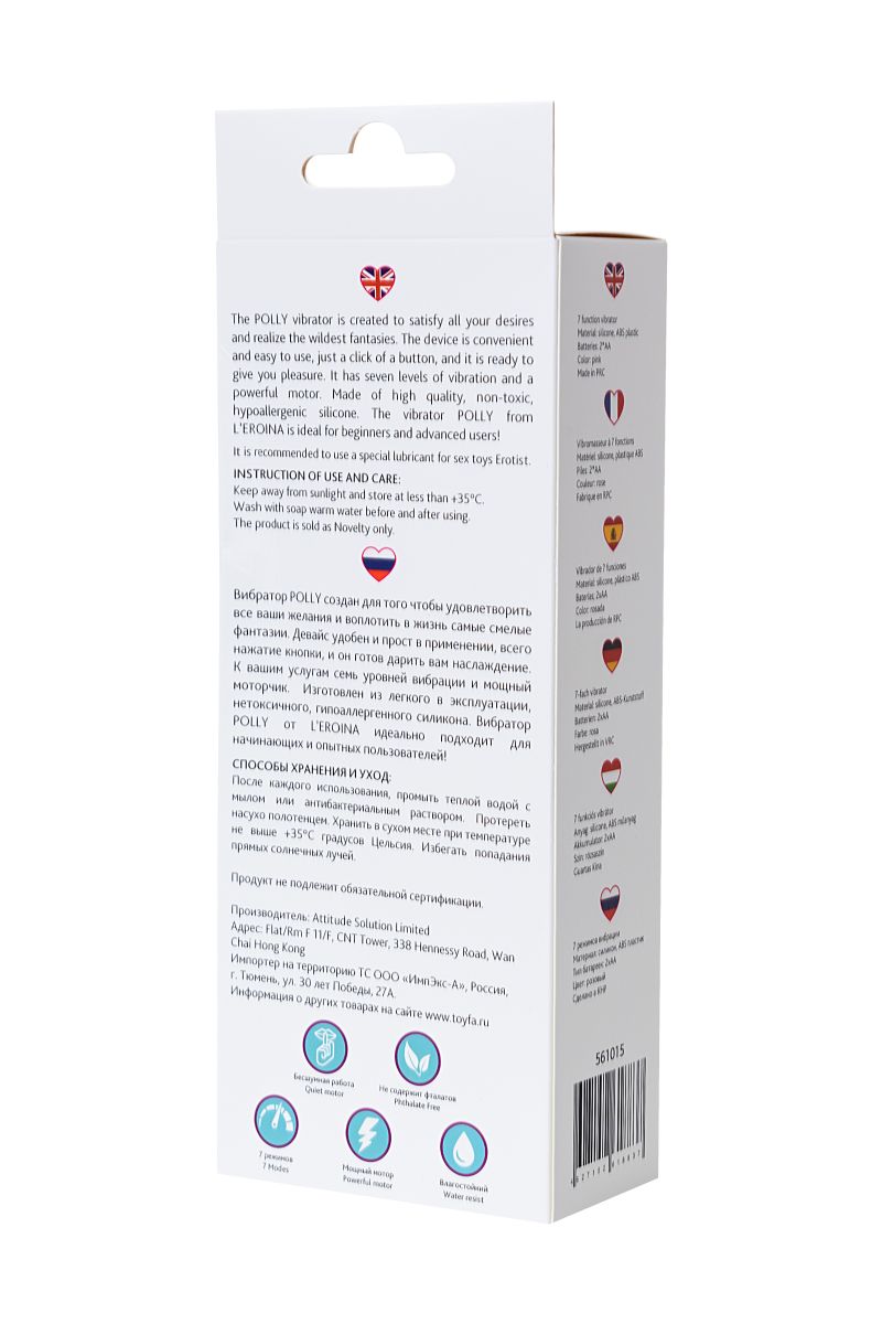 Вибратор POLLY создан для того, чтобы удовлетворить все ваши желания и воплотить в жизнь самые смелые фантазии. Девайс удобен и прост в применении, всего нажатие кнопки, и он готов дарить вам наслаждение. К вашим услугам семь уровней вибрации и мощный моторчик. Изготовлен из легкого в эксплуатации, нетоксичного, гипоаллергенного силикона. Рабочая длина - 13,5 см. Минимальный диаметр - 2,3 см.