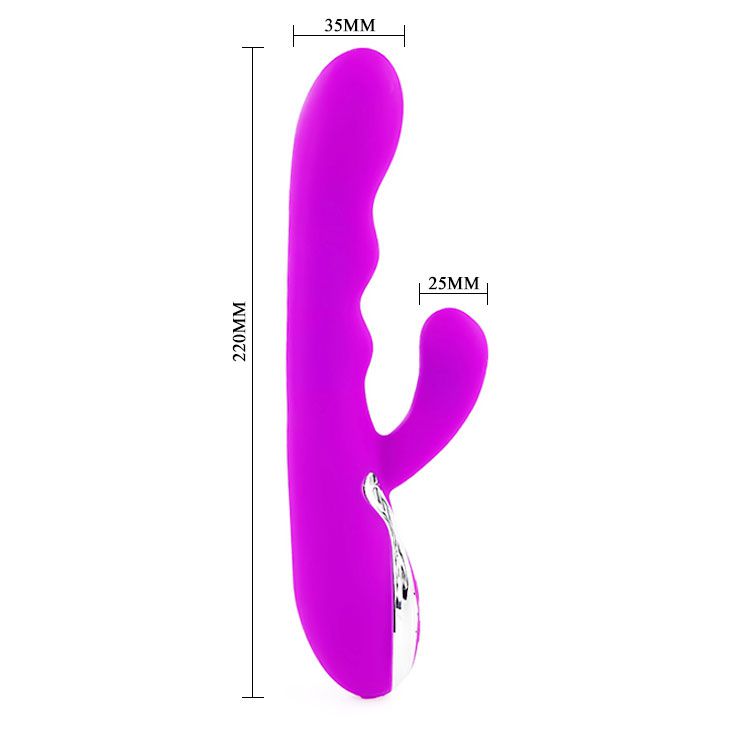 Вибромассажер эргономичной формы с клиторальным стимулятором. Предназначен для одновременной стимуляции точки G и клитора, на теле массажера имеются три утолщения с внутренней стороны, для точечного приложения вибраций. Имеет увеличенную в диаметре головку, для стимуляции точки G. Оснащен двумя независимыми моторами с мультискоростной вибрацией. Влагостойкий, перезаряжаемый от аккумулятора. Сделан из гладкого, шелковистого силикона, очень приятного на ощупь.