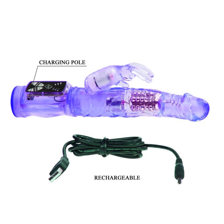 Гелевый вибратор с металлическими шариками, ротацией и дополнительным стимулятором клитора в виде кролика. Имеет 3 функции вибрации и 3 функции ротации. Приятный на ощупь, с чётко очерченной головкой. Может работать как от батареек, так и заряжаться от USB (провод для зарядки в комплекте). Рабочая длина - 18 см. Работает и от батареек - 3хААА (нет в комплекте).