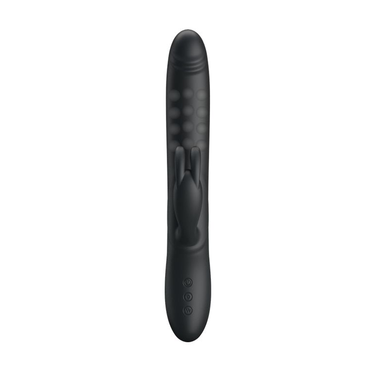 Черный вибратор с функциями вращения ствола и мощным клиторальным стимулятором в форме зайчика с 7 режимами вибрации и 4 режимами ротации (регулируются кнопками на основании). Вращение осуществляется при помощи металлических шариков , расположенных внутри изделия. Имеется возможность менять направление вращения. Водонепроницаемый. Рабочая длина - 16 см.