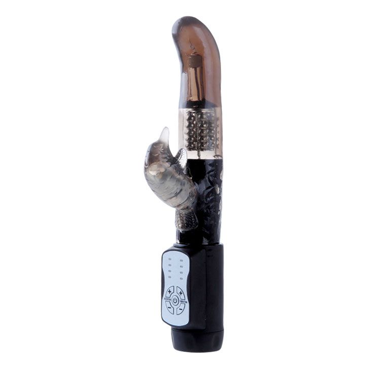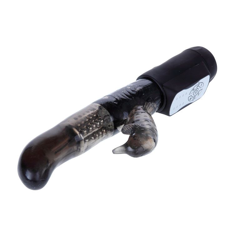 Черный вибратор с функциями вибрации (12 режимов) и ротации (4 режима). Способен глубоко проникать и нежно массировать стеночки вагины и самые дальние её уголки. Отросток в виде дельфина будет мягко стимулировать клитор, приближая волны оргазма. Рабочая длина - 10,3 см. Длина клиторального отростка - 5,6 см.