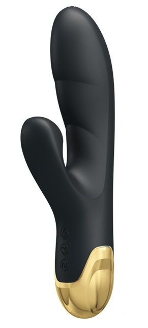 Стильный черный вибратор с рукояткой из напыления 24к золота. Изготовлен из медицинского нежнейшего силикона. Имеет клиторальный стимулятор, способный в 7 деликатных режимах стимулировать Ваш клитор. 7 функций вибрации унесут Вас к вершинам наслаждения. Режимами удобно управлять при помощи сенсорных кнопок в нижней части игрушки. Верхняя часть имеет рельефную поверхность для большей стимуляции. Данная игрушка имеет систему очистки, что позволит еще гигиеничнее использовать стимулятор. Зарядка вибратора происходит при помощи USB Рабочая длина - 11,2 см.