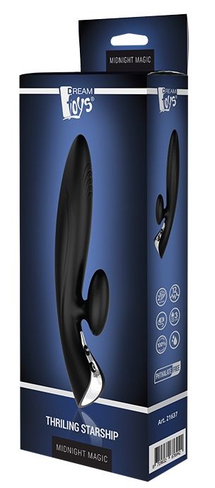 THRILLING STARSHIP - это гладкий вибратор, изготовленный из безопасного для тела силикона. имеющий изогнутую форму и стимулятор клитора. Он имеет 2 мощных мотора, предлагающих 3 варианта вибраций и 9 различных режимов.