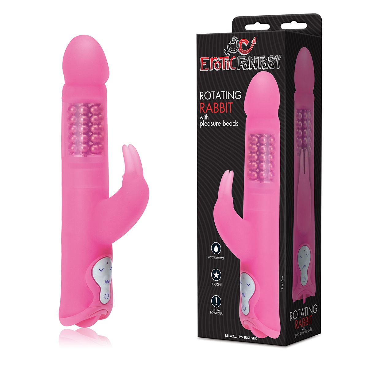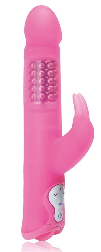Водонепроницаемый вибратор розового цвета со стимулятором клитора в виде зайчика, имеет восемь вращающихся рядов массажных шариков и реалистичную головку с ротацией. Сделан из гипоаллергенного силикона. Удобный пульт управления на рукояти игрушки позволяет регулировать 3 скорости вращения массажных шариков, а также 7 функций вибрации, пульсации и эскалации. Рабочая длина - 13,5 см.