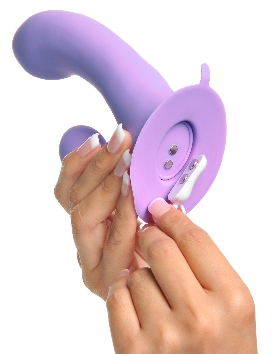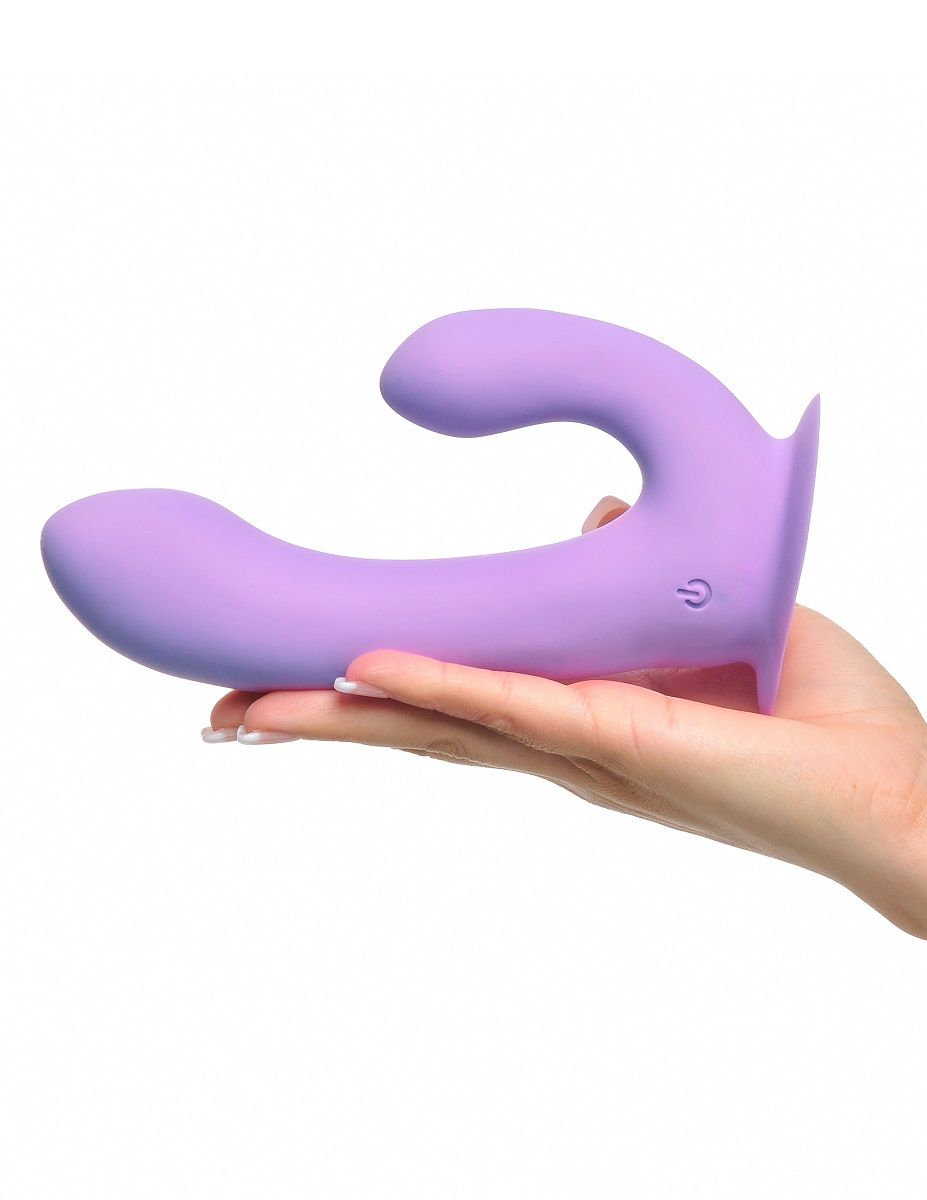 Сиреневый перезаряжаемый вибратор с клиторальным отростком Duo Pleasure Wallbang-Her. 11 функций вибрации. Присоска в основании. Рабочая длина - 12,7 см.