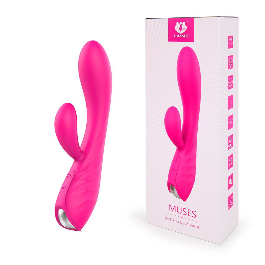 Ярко-розовый вибратор-кролик MUSES. Имеет клиторальный отросток для усиленной стимуляции. 9 режимов вибрации. Рабочая длина - 12,7 см.