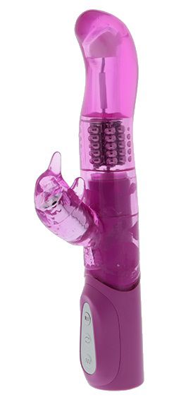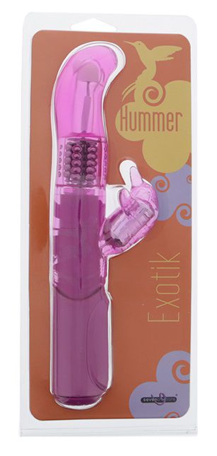 Розовый вибратор с загнутой вращающейся головкой и клиторальным стимулятором EXOTIK HUMMER. 7 режимов вибрации клиторального отростка. 3 режима вращения.