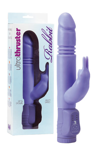 Сиреневый вибратор с клиторальным стимулятором. Совершает возвратно-поступательные движения. Мультискоростной. Водонепроницаемый.