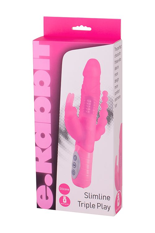 Вибромассажер-кролик SLIMLINE TRIPLE PLAY с анальной пробкой. Гибкий и слегка изогнутый ствол отлично подходит для стимуляции клитора. Многофункциональный вибратор для стимуляции всех горячих точек! SLIMLINE TRIPLE PLAY имеет гибкий ствол, перезаряжается и имеет 2 мощных двигателя. Один расположен в верхней части, а другой мотор находится в клиторальном стимуляторе. Водонепроницаем.