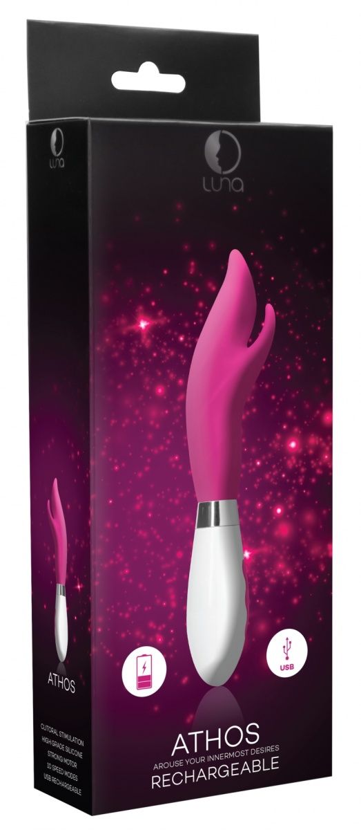 Athos – вибромасссажер-кролик. Эта игрушка имеет особую эргономичную форму, похожую на плямя, с толстым телом, заостряющимся к кончику, и близкорасположенный гибкий клиторальный отросток, что делает стимуляцию более концентрированной в зоне промежности. Вибромассажер имеет два мощных двигателя, по одному в каждом отростке, обеспечивающих 10 функций вибрации, способной достигать 7000 оборотов в минуту, при этом уровень звука не превышает 50 дБ. Вибромассажер заряжается через USB и может быть подключен практически в любом месте. Просто подсоедините идущий в комплекте шнур к совместимому порту компьютера или USB-адаптера (приобретается отдельно), а противоположный конец со штекером к игрушке. Полная зарядка занимает 30 минут, ее достаточно для беспрерывной работы до 60 минут.