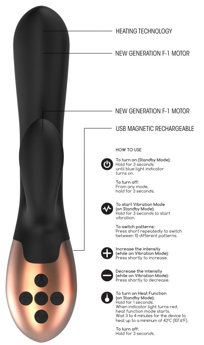 Элегантный вибратор для точки G имеет два моторчика невероятной мощности. Один расположен в кончике, а другой расположен в отростке. 10 уникальных функций вибрации (7 режимов вибрации с 3 разными уровнями интенсивности). Эта сексуальная игрушка нагревается до 42 градусов Цельсия, сделана из шелковистого силикона, водонепроницаема.