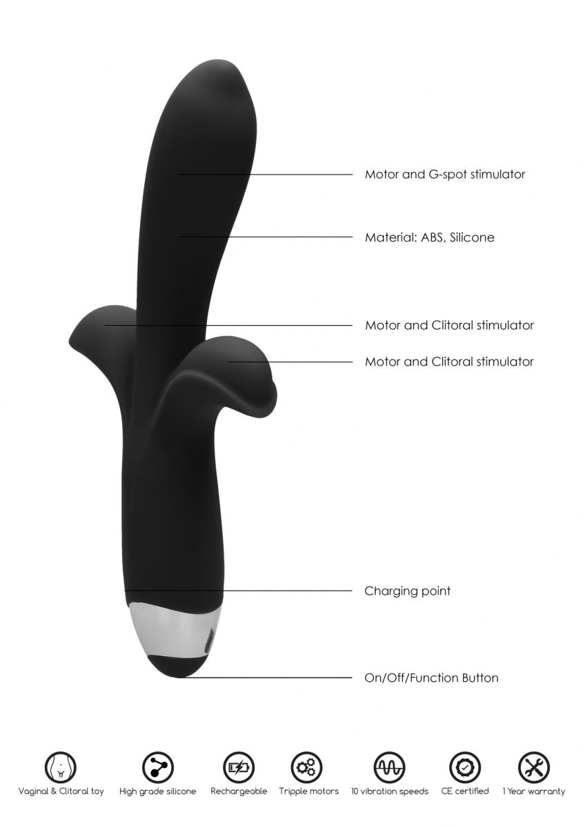 Вибратор классической формы с загнутой головкой и двумя отростками. Изготовлен из гладкого материала, приятен на ощупь. Имеет три отдельных моторчика и 10 режимов вибрации. Режимы переключаются при помощи кнопки в основании игрушки. Заряжается от USB. Рабочая длина - 11 см.
