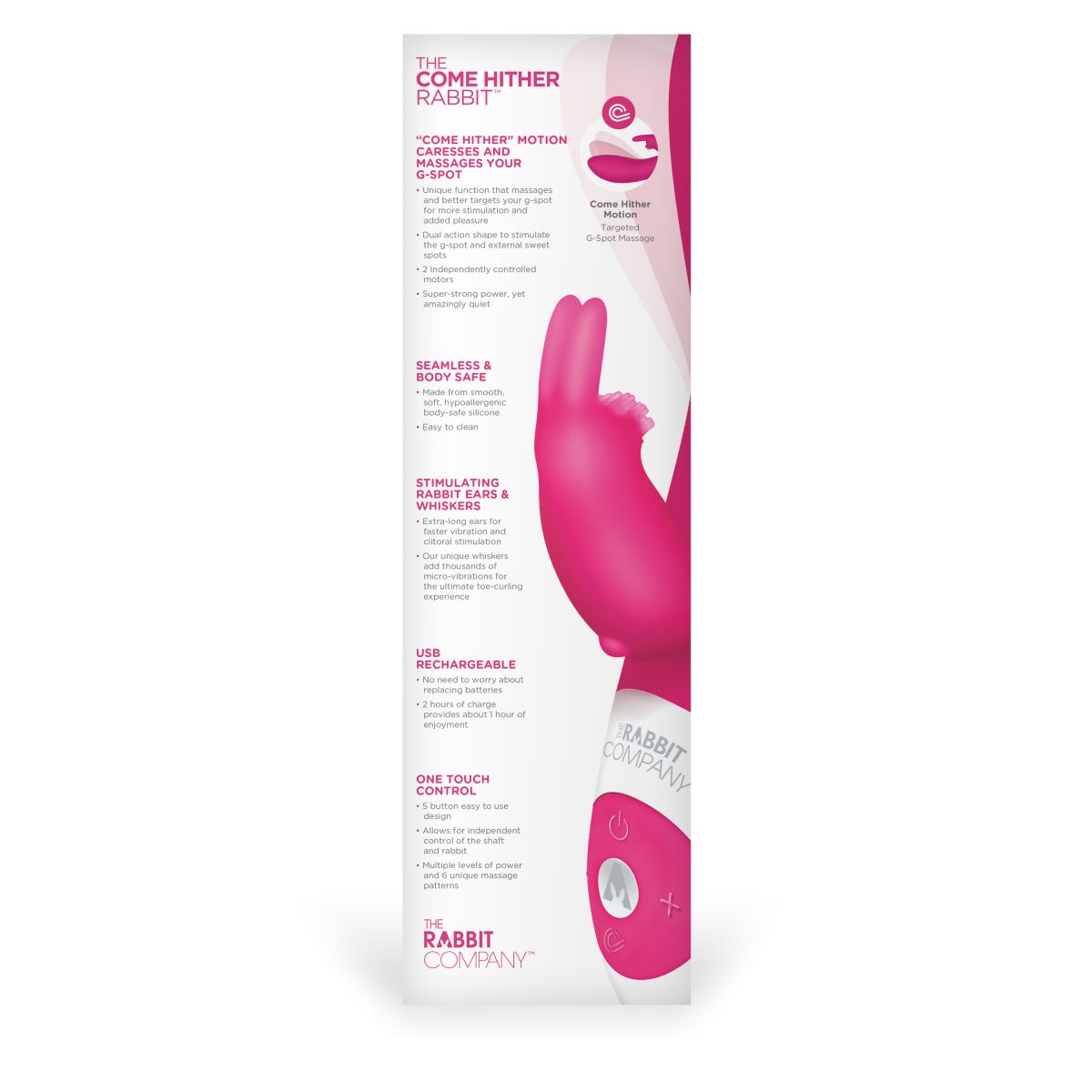 Ищешь игрушку, с которой можно испытать нечто новое и невероятно приятное? Она перед тобой! Изящный, качественный, безопасный массажер с уникальной манящей технологией - ствол вибратора воздействует на точку G, имитируя движения руки, когда ты подзываешь к себе любимого. Мощный моторчик имеет 5 скоростей работы основной части вибратора и 6 невероятных режимов клиторального кролика - постоянная вибрация, волновая вибрация, пульсация, нарастающая вибрация, то нарастающая, то ниспадающая, и рандомная вибрация. На мордочку клиторального кролика нанесена нежная щеточка для дразнящих ощущений во время стимуляции. Кролик имеет очень легкое управление - чтобы включить кролика используй отдельную кнопку включения, тогда одновременно заработают и вагинальная часть и клиторальный зайчик. Рабочая длина - 10 см. Время зарядки - 2 часа. Время работы - 1 час.