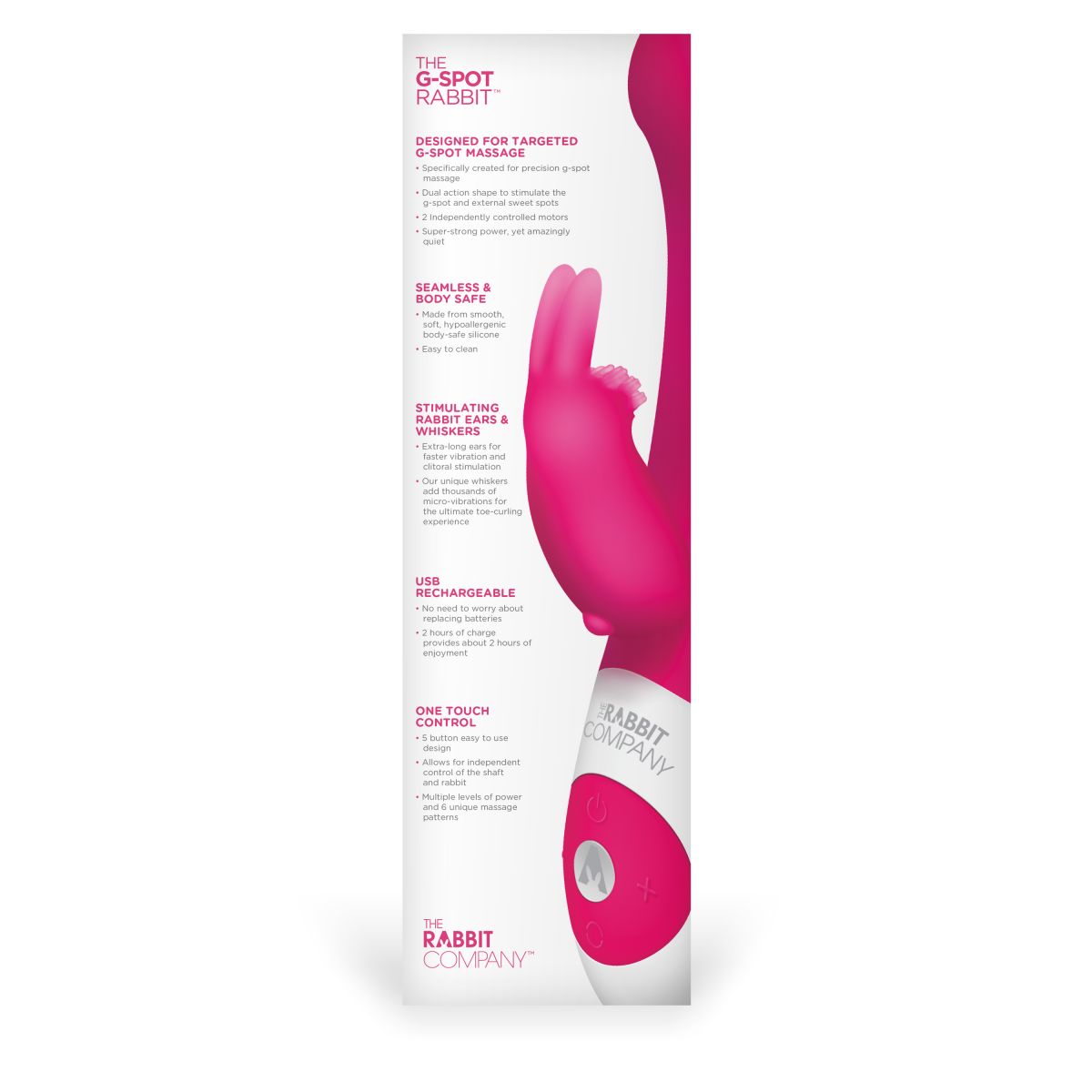 Уникальный по своему исполнению и качеству массажер из гипоаллергенного силикона малинового цвета. Два мощнейших мотора расположены в стволе массажера и в милом зайчике для клитора. Каждый из моторов имеет 6 режимов - классическая вибрация, волновая вибрация, пульсация, нарастающая вибарция, то нарастающая, то спадающая вибрация и рандомная. У каждого режима ты можешь менять интенсивность. Вместе с игрушкой вы получаете буклет с графиком возможной вибрации на каждом из 6 режимов работы. Ствол массажера имеет специальную форму, которая позволяет точечно воздействовать на точку G. Рабочая длина - 11 см. Время зарядки - 2,5 часа. Время работы - 2 часа.
