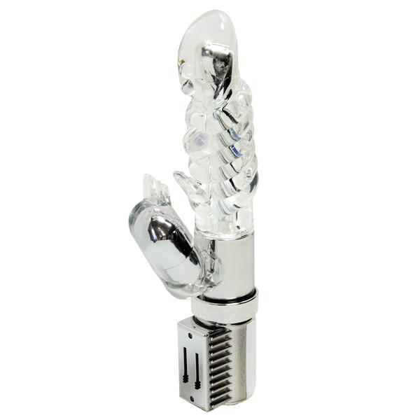 Прозрачный вибромассажёр с клиторальным отростком. 2 встроенных виброэлемента - в кончике и в клиторальном отростке.