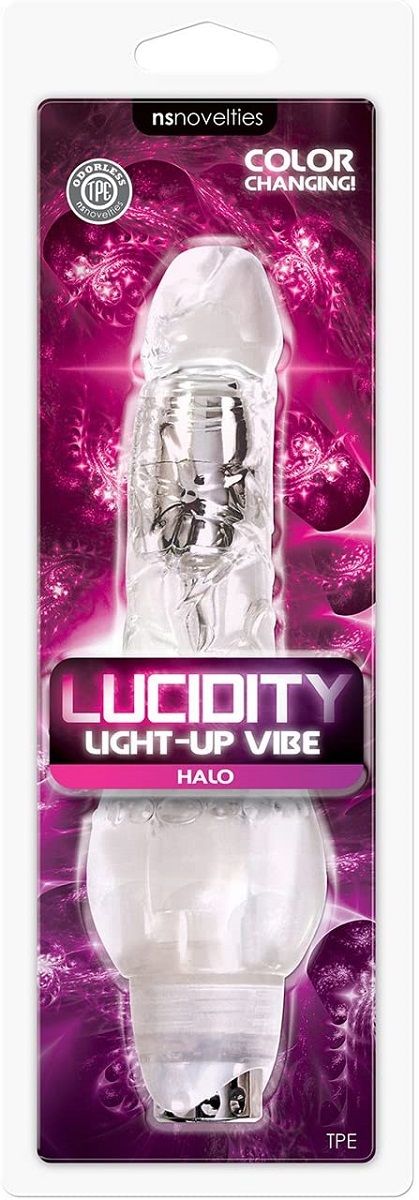 Прозрачный вибратор-реалистик Lucidity Halo Light Up Vibe. Виброэлемент расположен ближе к головке для лучшего воздействия на стеночки лона. Мультискоростная вибрация. Водонепроницаемый. Рабочая длина - 13,5 см.