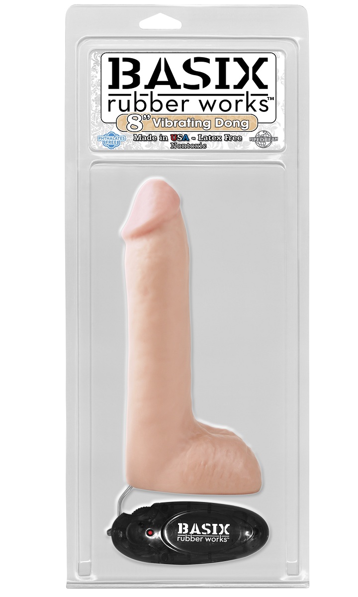 Телесный вибромассажер BASIX. Классический мультискоростной вибромассажер из телесного пвх с мошонкой и выносным пультом управления вибрацией.