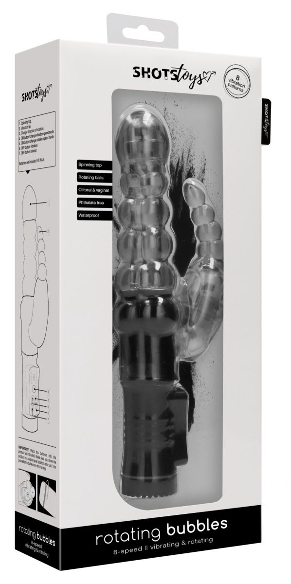 Rotating Bubbles – вибромасссажер-кролик с функцией ротации. Два сверхмощных моторчика обеспечивают 8 уникальных функций вибрации, способных достигнуть скорости больше 15.500 оборотов в минуту, но при этом не очень громкие на уровне 50 дБ. Вагинальный отросток у этой модели имеет шесть постепенно увеличивающихся звена и функцию ротации. Клиторальный отросток состоит из четырех пузырьков и управляется отдельно. Рабочая длина - 11 см.