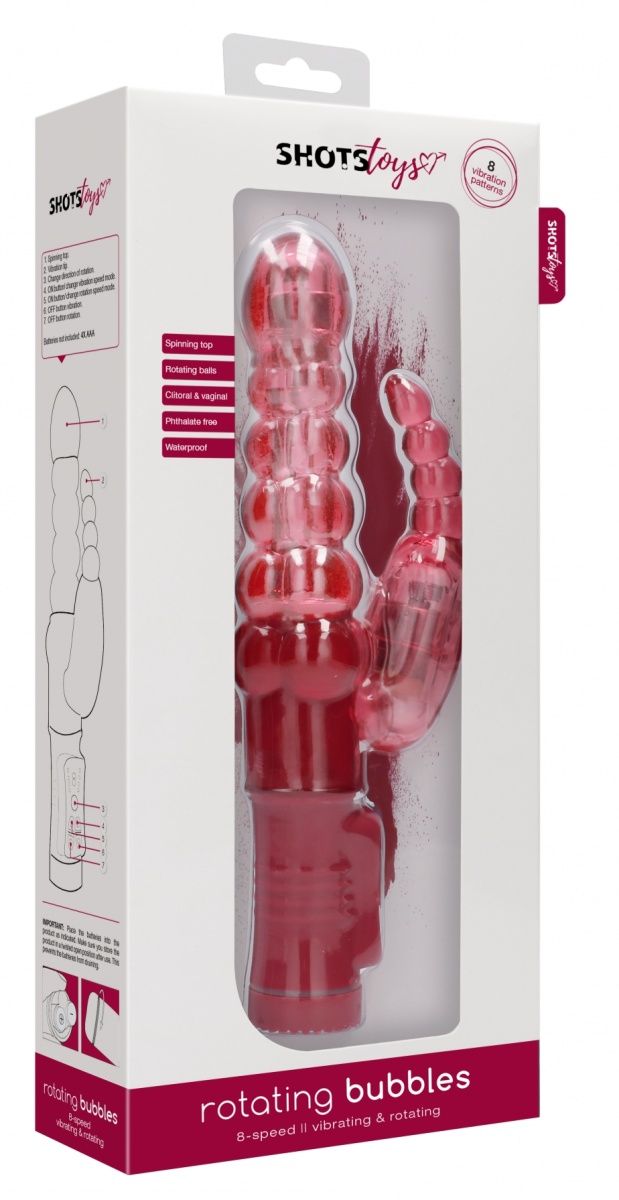 Rotating Bubbles – вибромасссажер-кролик с функцией ротации. Два сверхмощных моторчика обеспечивают 8 уникальных функций вибрации, способных достигнуть скорости больше 15.500 оборотов в минуту, но при этом не очень громкие на уровне 50 дБ. Вагинальный отросток у этой модели имеет шесть постепенно увеличивающихся звена и функцию ротации. Клиторальный отросток состоит из четырех пузырьков и управляется отдельно. Рабочая длина - 11 см.