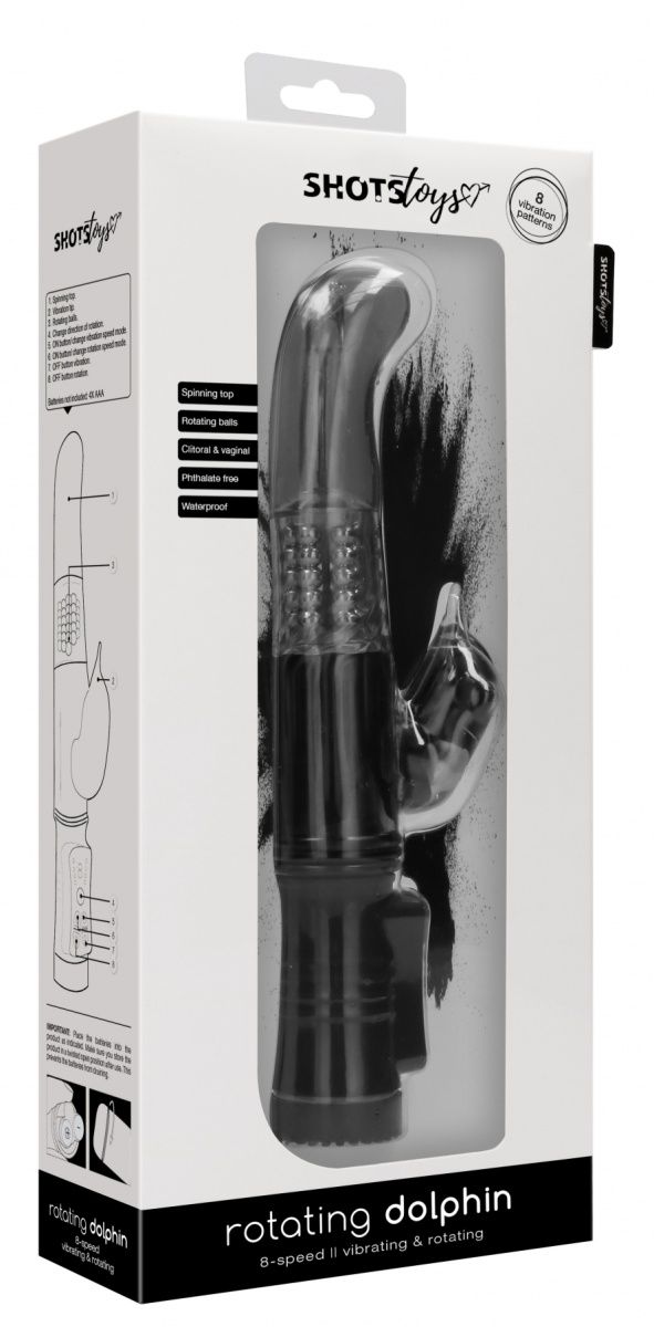 Rotating Dolphin – вибромасссажер-кролик с функцией ротации. Два сверхмощных моторчика обеспечивают 8 уникальных функций вибрации, способных достигнуть скорости больше 15.500 оборотов в минуту, но при этом не очень громкие на уровне 50 дБ. Вагинальный отросток у этой модели имеет вращающиеся бусины и загнутый кончик для целенаправленной стимуляции. Клиторальный отросток имеет конусообразный носик и управляется отдельно. Рабочая длина - 11,5 см.