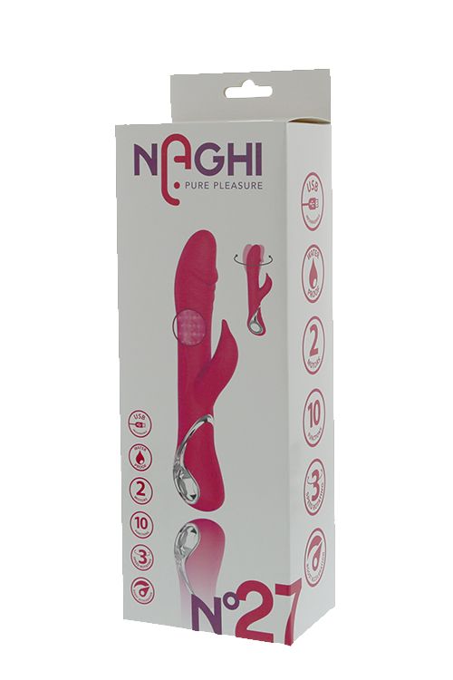 NAGHI NO.27 RECHARGEABLE DUO VIBRATOR - вибратор с клиторальным стимулятором, с вращением. Имеет 2 рабочих мотора. 10 режимов работы и 3 варианта ротации, а бусинки внутри ствола добавят ощущений. Вибратор заряжается от usb-провода (в комплекте), что обеспечивает 2 часа игрового времени. Водонепроницаем. Рабочая длина - 15 см.