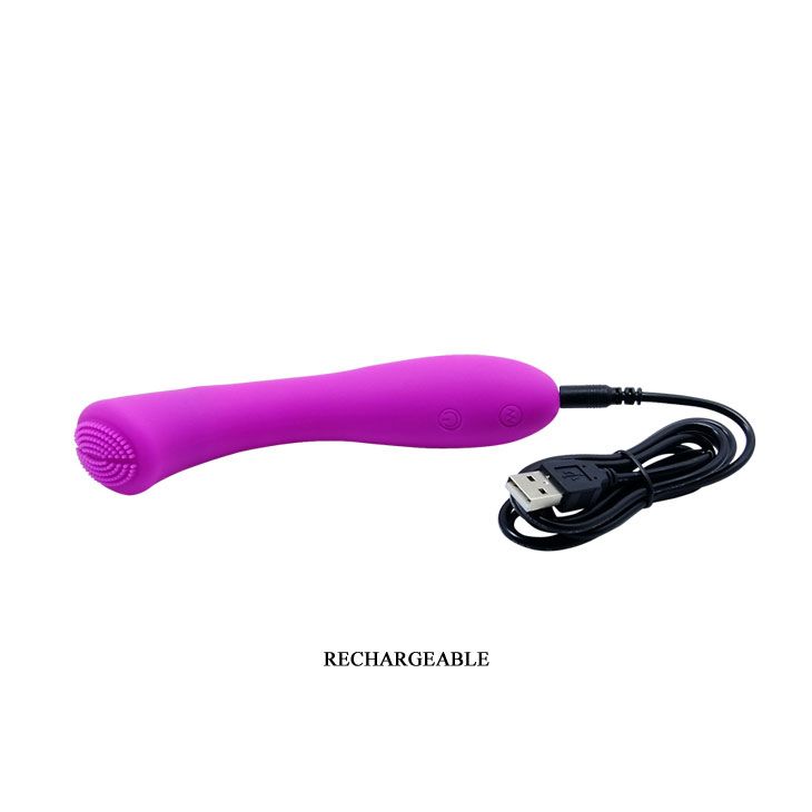 Вибромассажер из приятного на ощупь силикона с необычной головкой. Верхняя часть игрушки покрыта мелкими и очень мягкими пупырышками для особенно сладкой стимуляции. Эргономичная форма, отсутствие швов делают игрушку привлекательной, а сенсорные кнопки управления сделают ее использования легким. Имеет 30 функций вибрации. Заряжается при помощи кабеля USB (в комплекте).