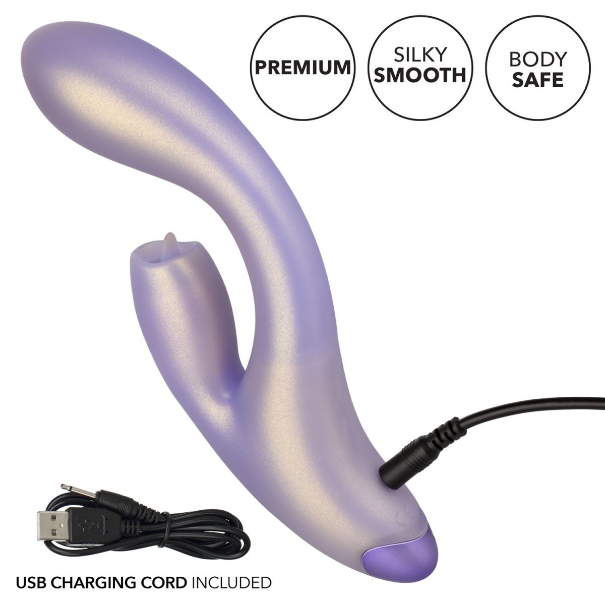 G-Love GKiss – двойной стимулирующий массажер с мерцающим язычком на клиторальном отростке. Вибратор кролик выполнен из 100% качественного силикона, основной ствол имеет 12 функций вибрации, в то время как клиторальный язычок двигается в 7 различных вариантах. Изгиб основного ствола отлично стимулирует точку G, а клиторальный отросток прекрасно симулирует оральные ласки. Управление осуществляется с помощью 3 кнопок в основании. Чтобы включить или выключить стимулятор, необходимо нажать и в течение трех секунд удерживать верхнюю кнопку питания. Вибромассажер заряжается через USB и может быть подключен практически в любом месте, просто подсоедините идущий в комплекте шнур к совместимому порту компьютера или USB-адаптера (приобретается отдельно), а противоположный конец к разъему у основания. Полная зарядка занимает 120 минут, ее достаточно для беспрерывной работы в течение 55 минут. Рабочая длина - 13,75 см. Длина клиторального отростка - 4,5 см., диаметр - 2,5 см.