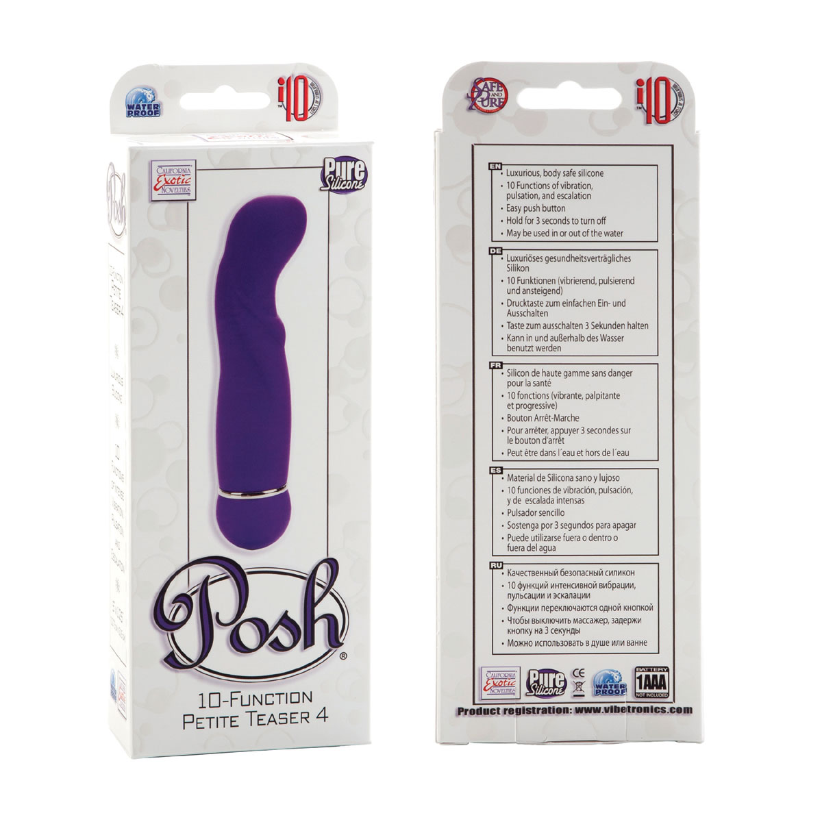 Вибромассажер POSH Petite Teaser 4 - шелковистый мягкий универсальной формы с изгибом головки для стимуляции G-точки. Мощный бесшумный встроенный вибратор с 10-ю функциями интенсивной вибрации, пульсации и эскалации. Функции переключаются с помощью кнопки со светодиодом - удерживайте ее в течение 3 секунд, чтобы выключить функцию на любой ступени. Рабочая длина - 12,8 см.