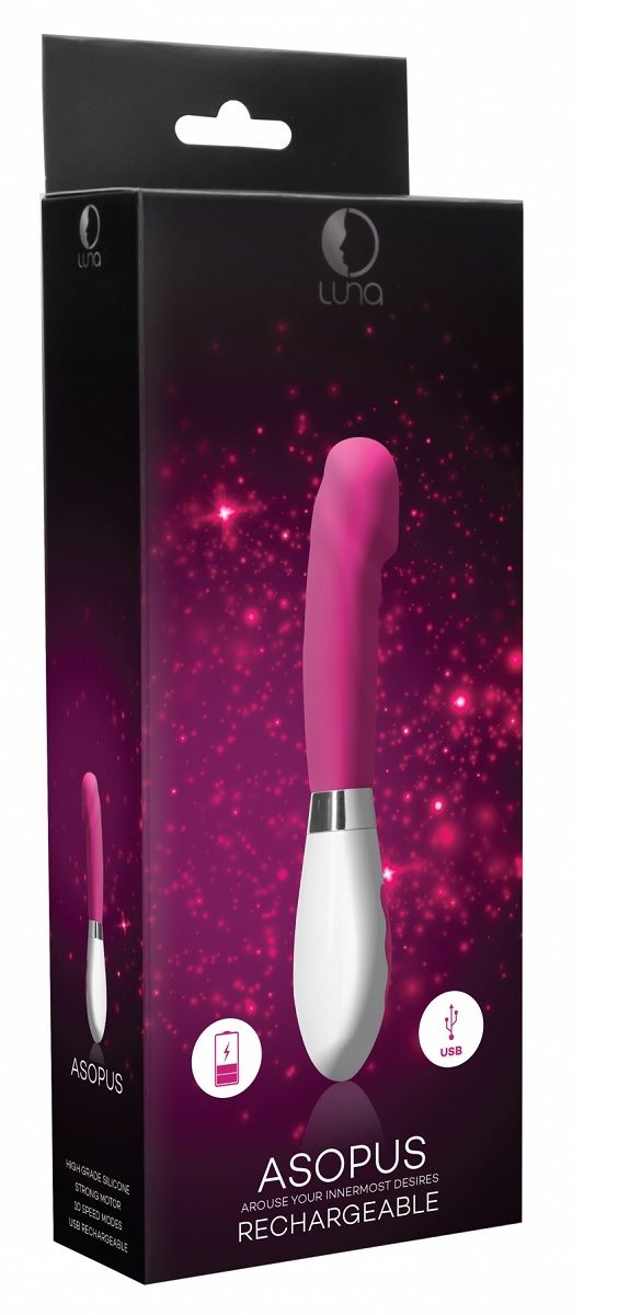 Asopus – вибромассажер для точки G. Эта игрушка имеет особую эргономичную форму с ярко-выраженной фаллической головкой, что делает стимуляцию более целенаправленной. Вибромассажер имеет 10 функций вибрации, способной достигать 5200 оборотов в минуту, при этом уровень звука не превышает 50 дБ. Вибромассажер заряжается через USB и может быть подключен практически в любом месте. Просто подсоедините идущий в комплекте шнур к совместимому порту компьютера или USB-адаптера (приобретается отдельно), а противоположный конец со штекером к игрушке. Полная зарядка занимает 30 минут, ее достаточно для беспрерывной работы до 60 минут. Рабочая длина - 11,5 см.