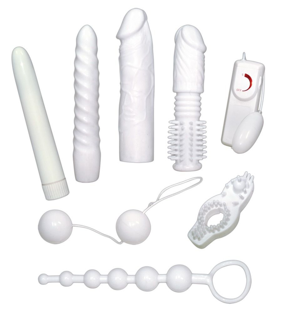 Набор состоит из 8 белых любовных игрушек: 1. Вибратор 2. Виброяйцо 3. Дуэт вагинальных шариков 4. Насадка для вибратора - имитация пениса 5. Насадка для вибратора - спиралевидная 6. Насадка для вибратора - 3 в 1 (реалистик, спираль, усики) 7. Насадка кольцо на пенис с дополнительно стимуляцией клитора и ануса 8. Анальные бусы. Все игрушки изготовлены из ТПЕ, удерживающего тепло и приятного на ощупь. Длина вибратора - 17,5 см., диаметр - 2,5 см.